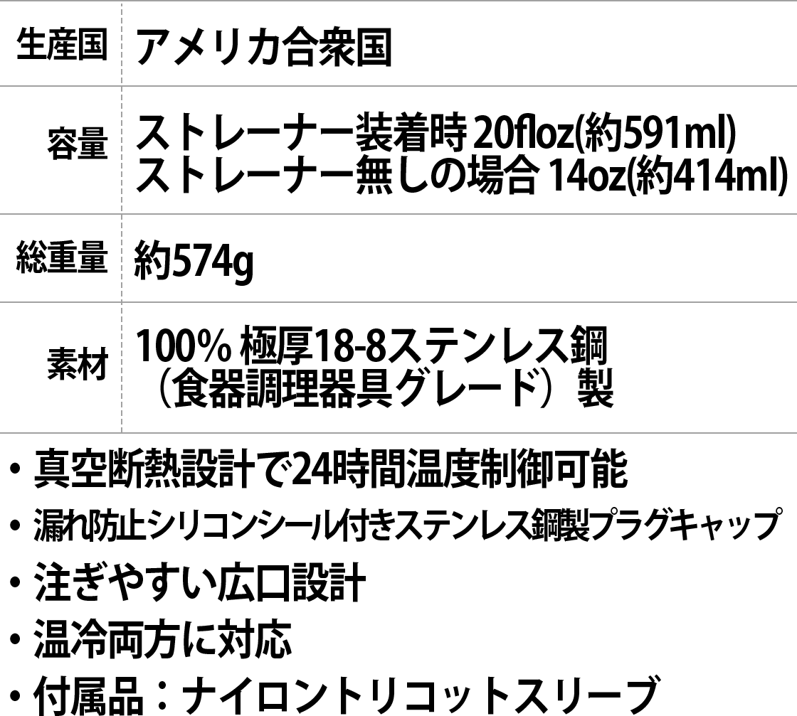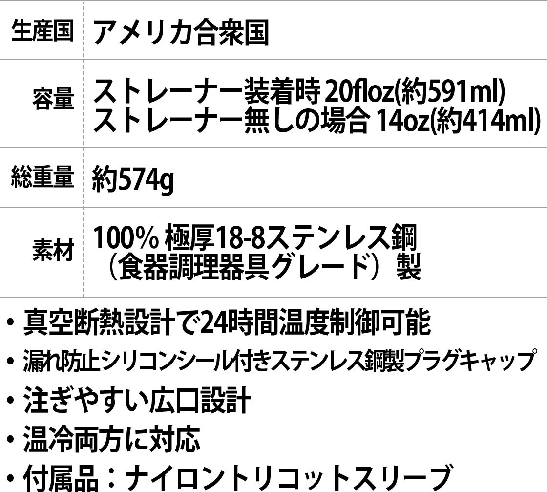 A. ストレーナー装着時 20floz(約591ml) / ストレーナー無しの場合 14oz(約414ml)です。