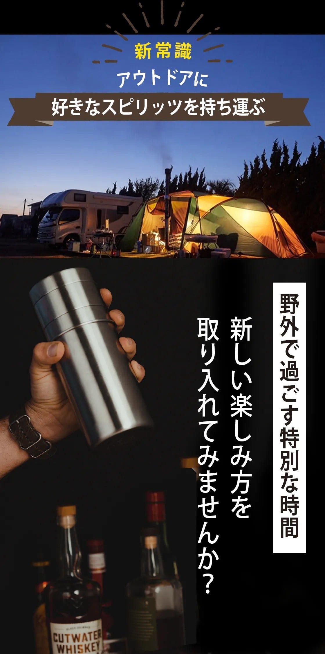 【アウトドア×お酒】の楽しみ方を日本のユーザーに提案した第一弾 お酒のためのタンブラー付きボトル『Firelight Flask』