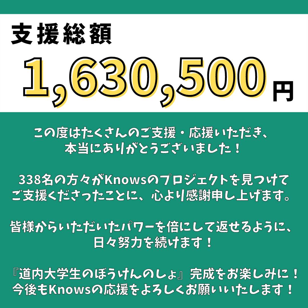 2022/02/07 19:00こんばんは!Knows代表の金子新太郎です!まず最初にお伝えさせてください。12/16からKnowsのことを応援・ご支援くださった皆様、本当にありがとうございました!皆様のおかげで私たちのプロジェクトはのべ338名の方々から総額163万500円を集めることに成功いたしました。最初の想定をはるかに超える金額で驚きを隠せないのが正直なところです。私たちKnowsは沢山の方々から支えられていることを実感いたしました。本当にありがとうございました!さて、私たちにとって大きなプロジェクトであるクラウドファンディングは終了しましたが、本番はここからになります。4月に間に合わせるために大急ぎで雑誌の制作を進めなければなりません。(もちろんクオリティには気を使いながら)皆様から頂いた貴重な想いとお金をもとに「北海道の大学生に一歩踏み出すきっかけを提供する雑誌Knows」を必ず作り、お届けしますのでどうか楽しみにお待ちください!では最後になりますが、この度はKnowsのクラウドファンディングにご協力くださり本当にありがとうございました! もっと見る