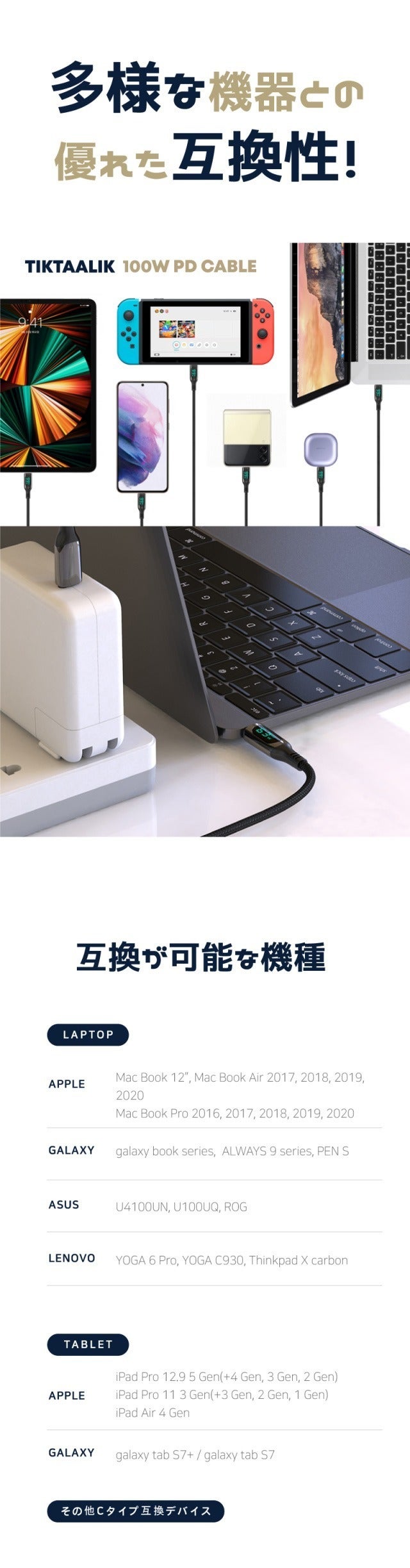 TIKTAALIK 100W PD Cableは100W急速充電が可能でQualcomm Quick Charge 4.0などさまざまな機能と互換ができます。またE-markerチップセットを使用しており、より高い性能を発揮します。さらにLCDディスプレイは鮮明で、一目でわかるように電力と急速充電を表示します。小数点第1位まで表示されるため、より正確な測定が可能となります。PD (Power Delivery) 急速充電が可能で、より効果的な充電ができ、引張強度の高いナイロンを使用しています。