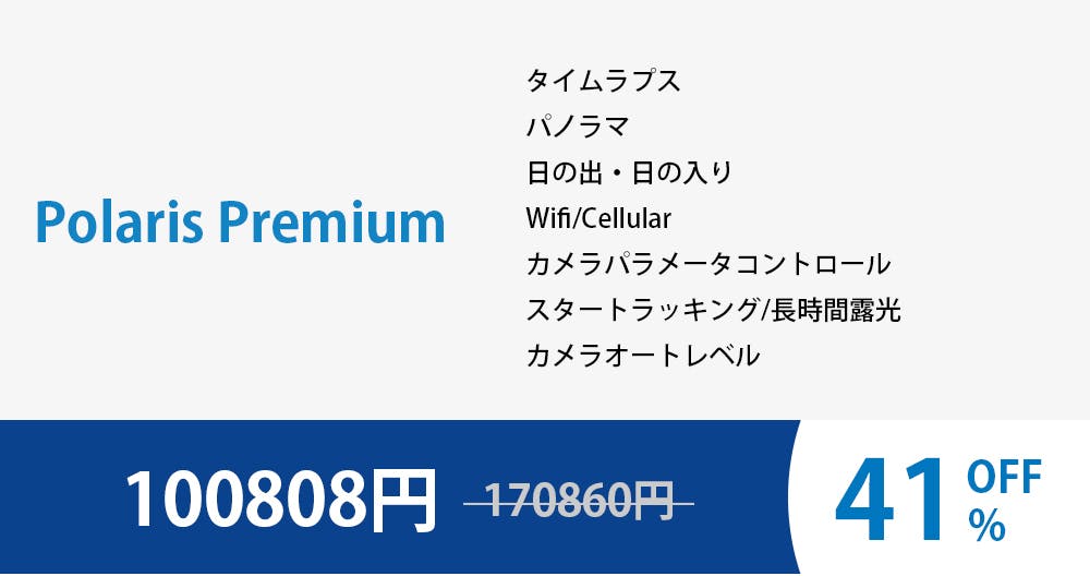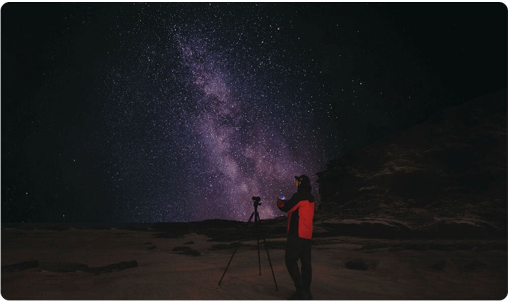 夜空を撮影する場合、ポラリスは、赤道儀式架台と全く同じ様に精度良くヘッドが動き、星の軌跡を線の様に撮影するのを防ぎます。この機能を使うと天の川やお気に入りの星座をとても綺麗に撮影できます。この搭載機能を使えば、撮影アングルを調整することも出来ます。