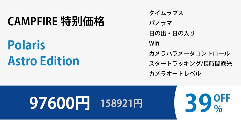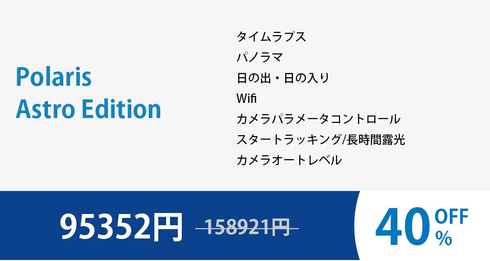 そしてポラリスに視覚補正機能を追加しました。ポラリスを長時間露光の深空撮影に使うと、ポラリスは一連の写真を撮影し、各写真を長時間露光で撮ります。写真撮影後、ポラリスはそのフレーム内の星の正確な位置を認識し、カメラの動きと方向を修正してくれます。これにより数十分撮影することや、ポジショニングを何度も変更して何時間も撮影をやり直す必要がなくなります。撮影が完了すると、ポラリスは撮影した写真の位置を合わせて積み重ね、超長時間露光写真を作成します。