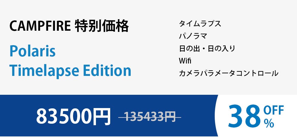 車内で暖かく過ごしながら日の出と日の入りを撮影したり、家のソファに座ったままで星空を撮影したりできます。ポラリスには2つのバージョンがあります。1つはWi-Fiによるリモート操作機能が搭載されています。もう1つは、Wi-Fi機能に加えて携帯電波を利用した操作で、携帯電話の電波がある場所であれば距離に関係なくどこからでも撮影が出来ます。