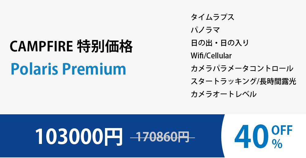 ポラリスを使えば素晴らしい撮影アングルを簡単にフレームに収めることができます。風景写真や自然写真、更には天体写真が好きな人にまでぴったりです。ポラリスを使うと撮影が誰でも効率的でとても簡単になります。更に、パノラマ写真、タイムラプス、露光補正、段階露光など、通常パソコン処理が必要になる写真を自動レンダリングします。ポラリスを開発し、世界展開することにより、従来のカメラ用三脚が直面している技術的な壁を破り、より先進的でインテリジェントなステージまで進めたいと考えています。