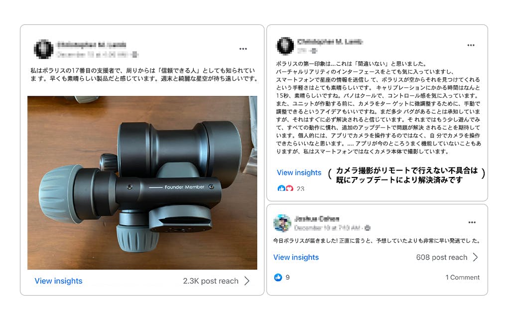 2022/06/10 19:19支援者の皆様へ。お待たせして申し訳ございません。最新の発送スケジュールをお知らせいたします。6月20日頃に工場から全てのユニットが引き渡され、私たちは出荷のための梱包作業を開始する予定です。発送は6月末に開始し、7月中にすべての発送を完了する予定です。発送は航空便で行いますので、納期は出荷から7~10日程度になるかと思います。お待たせして申し訳ございませんが、今後ともPolarisをよろしくお願いいたします。 もっと見る