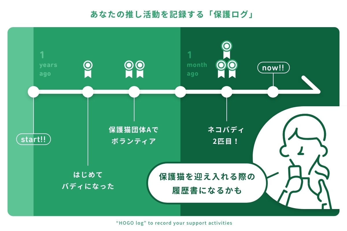 さらに、あなたのneco-note内での推し活動はすべて「保護ログ」として保存されます。 歴代のネコバディや推し活の履歴、ボランティアの経歴などを見返すことができます。