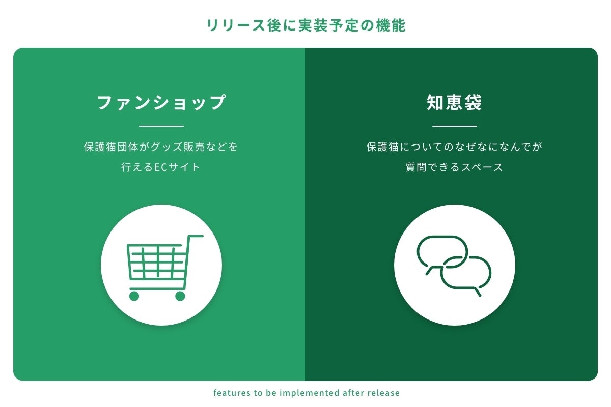 リリース後は、徐々に新機能も実装していきます。 保護猫団体がグッズ販売などを行える"保護猫ファンショップ"や、保護猫についての知恵袋などなど。 保護猫に関わる人たちを巻き込んで、猫が助かる循環を生んでいきます。