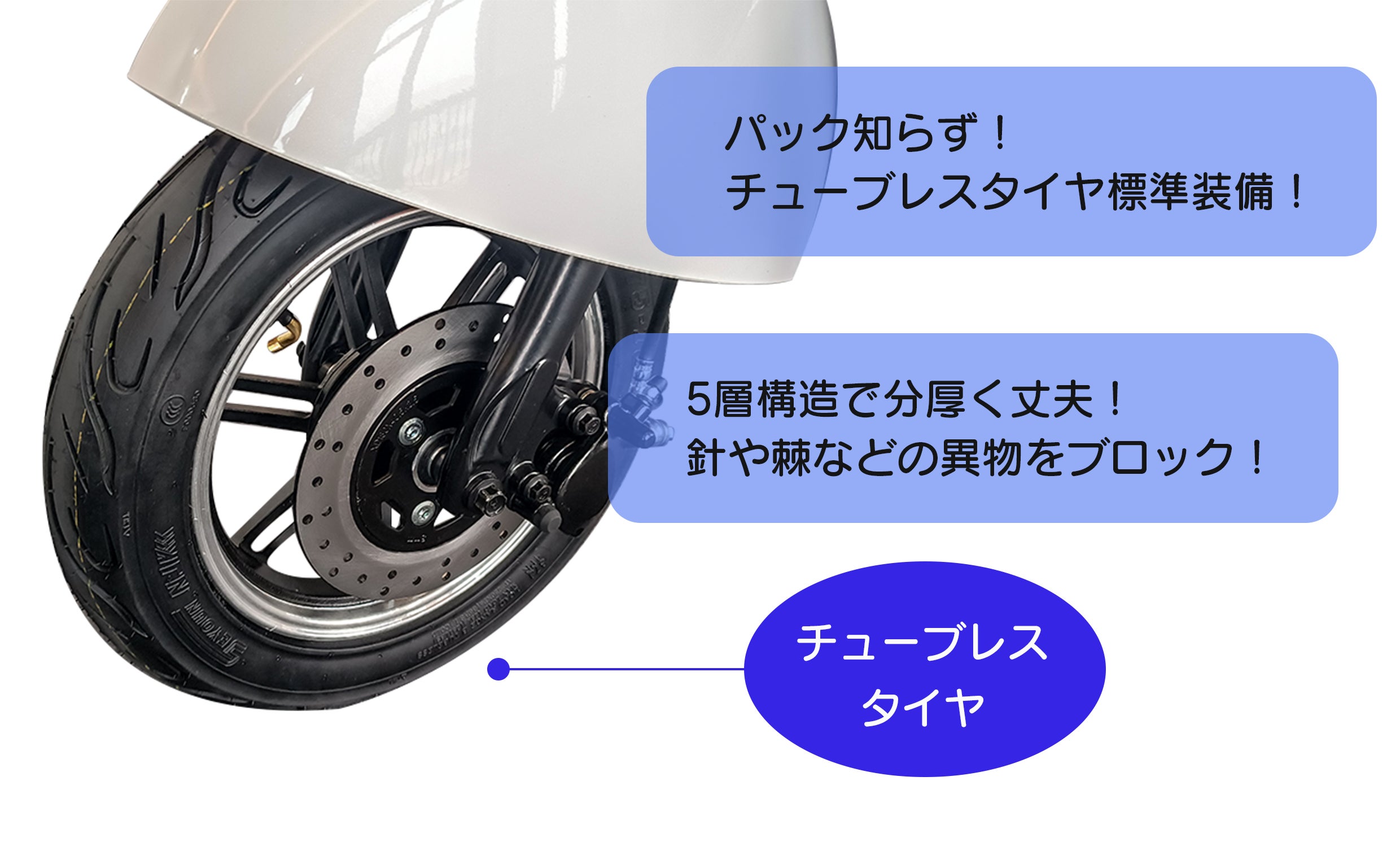 A:チューブレスタイヤですのでパンクに強いです。