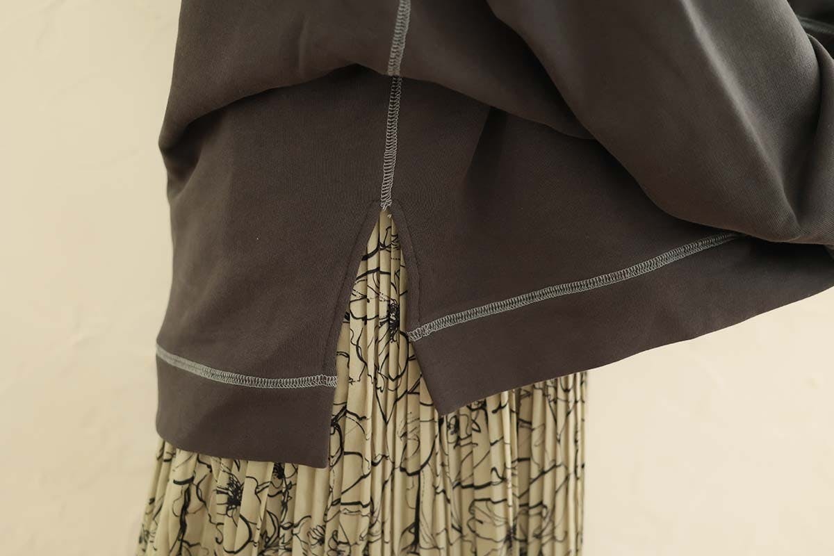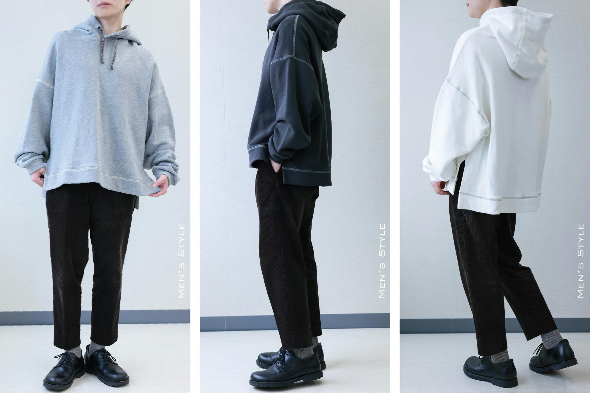 わずかに前後アシンメトリー仕様にし、オーバーサイズ仕様ながらスッキリ感のある着こなしにすることができ、スリットも入り着やすくなっております。