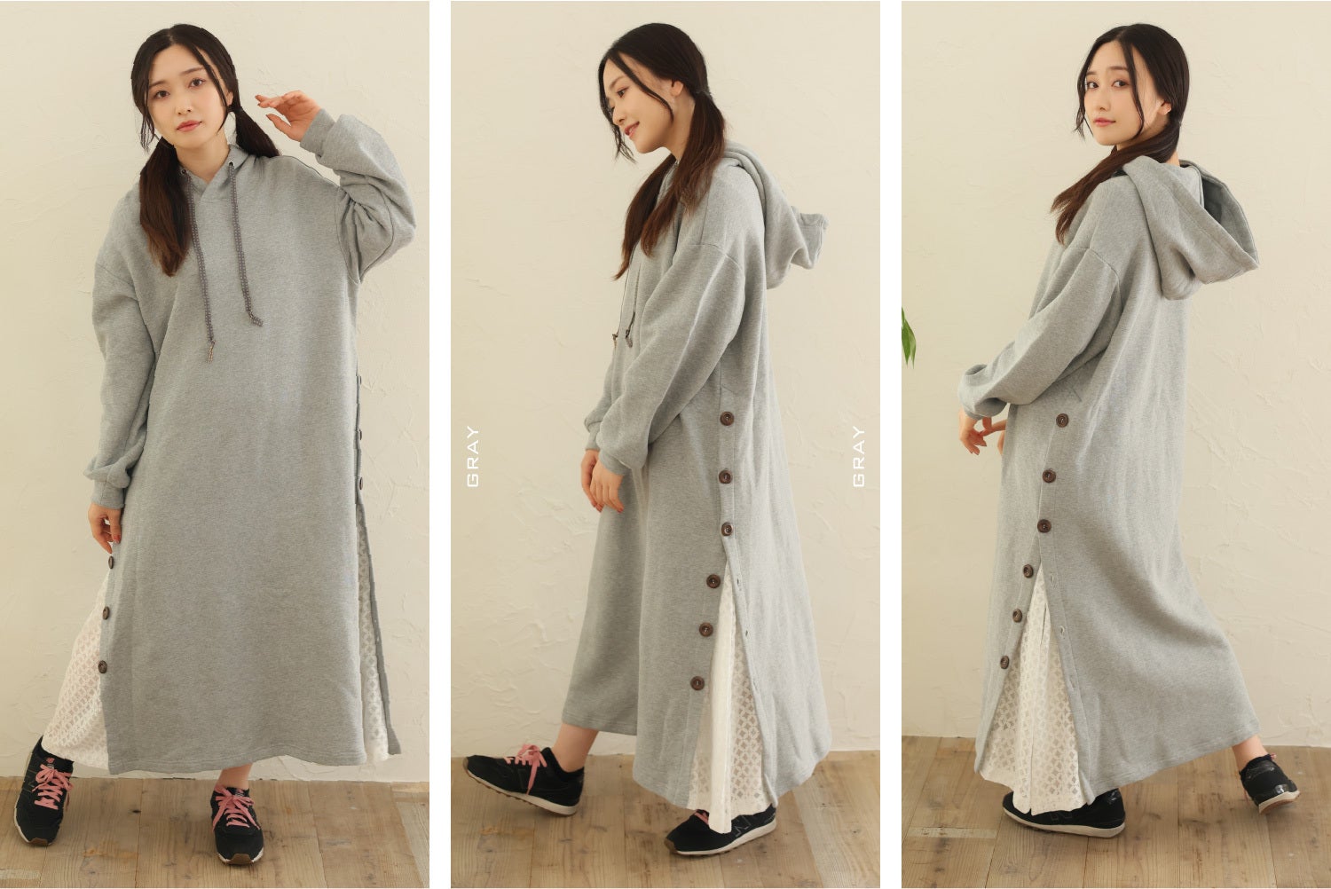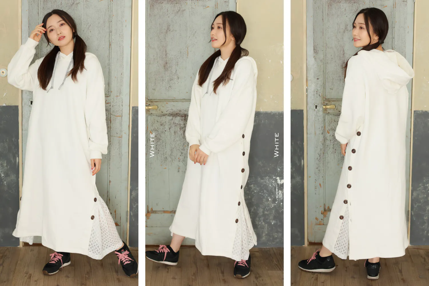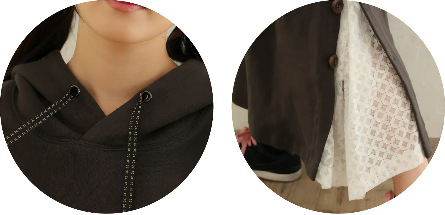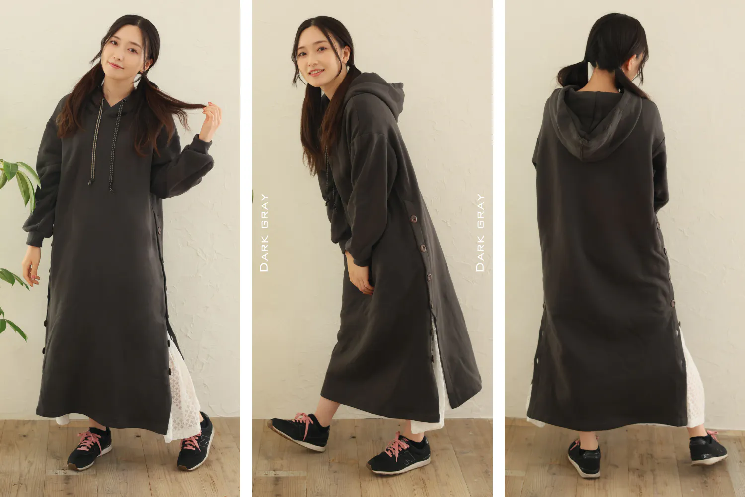 これまでYuruwa*は「和服を気軽に着れる」がコンセプトのゆる袴・ゆる着物を展開してきました。今回は和風がお好きな方が外出先でも着用いただきやすいよう「1%"和”気分を楽しめる」をコンセプトにフードワンピースを製作いたしました。シンプルで綺麗めなフードワンピースですが、細部にこだわりの和要素を取り入れており、これから和コーデに挑戦したい方でも自然とお楽しみいただけます。ダークグレー・ホワイト・グレーの3色展開でお持ちのアイテムと合わせても間違えないカラーバリエーションを選定しています。