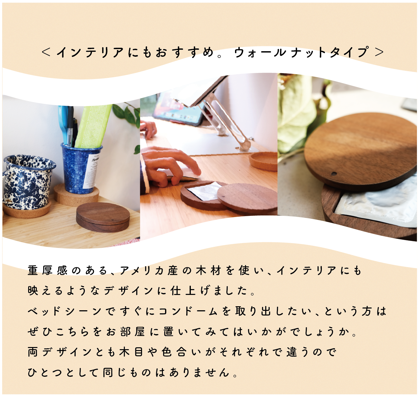 A.「このケースかわいいでしょ?中に何が入っていると思う?」のように、友達にCosmosのコンドームケースを見せながらお話ししてみてください。Cosmosのコンドームケースは、友達やパートナーと性の会話のきっかけにしやすいよう、見た目の洗練さや木材使用にこだわっていおり、いちオシャレアイテムとして持っていただくことも可能です。