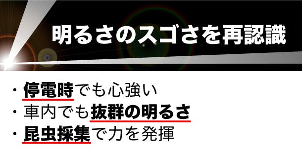 木々を照らすと以前使っていた懐中電灯とは比較にならない明るさで広範囲を探れ、 発見した木を揺らして落ちてきたカブトムシも簡単に見つかりました。