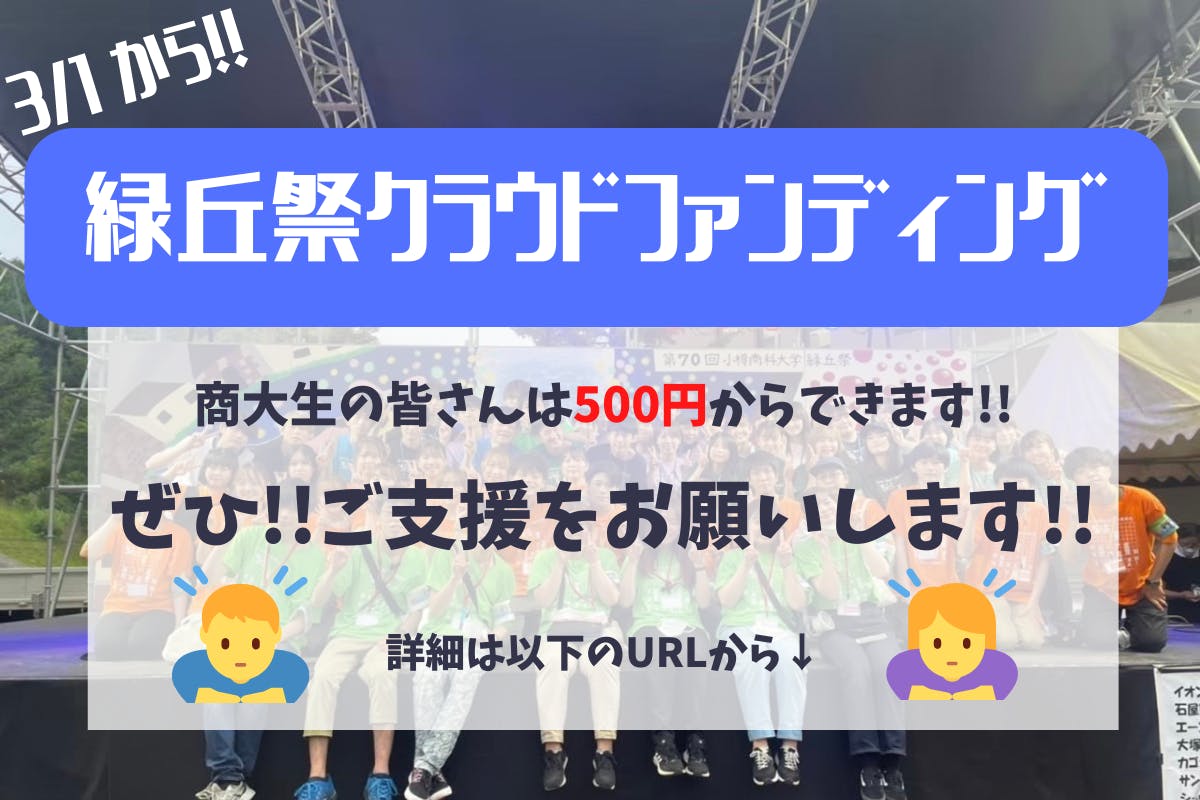 2023/03/04 10:00https://camp-fire.jp/projects/view/652029?utm_campaign=cp_po_share_c_msg_mypage_projects_show緑丘祭を応援くださっている支援者の皆様へいつもお世話になっております。緑丘祭実行委員会です!この度は、昨年支援を頂いた皆様をはじめ、このサイトをご覧になられている皆様へお願いがありご報告させていただきました。現在、緑丘祭実行委員会は3月1日より第71回緑丘祭クラウドファンディングを実施しております。目標金額は20万円を目指す挑戦となります。小樽商科大学の大学祭である緑丘祭は、今年で71回目の開催となります。昨年は新型コロナウイルスの影響を受けながらも、3年ぶりに対面で開催することができました。今年は、昨年の盛り上がりを超え、さらに緑丘祭を“最高の青春”が感じられる場所にすることを目標にしています。最後まで頑張りますので、もしよろしければ以下のURLから一度第71回緑丘祭クラウドファンディングの概要をご覧いただき、今年の緑丘祭へも温かいご支援やプロジェクトへの応援、シェアをしていただけますと嬉しいです!どうぞよろしくお願いいたします。第71回緑丘祭実行委員会 https://camp-fire.jp/projects/view/652029?utm_campaign=cp_po_share_c_msg_mypage_projects_show もっと見る
