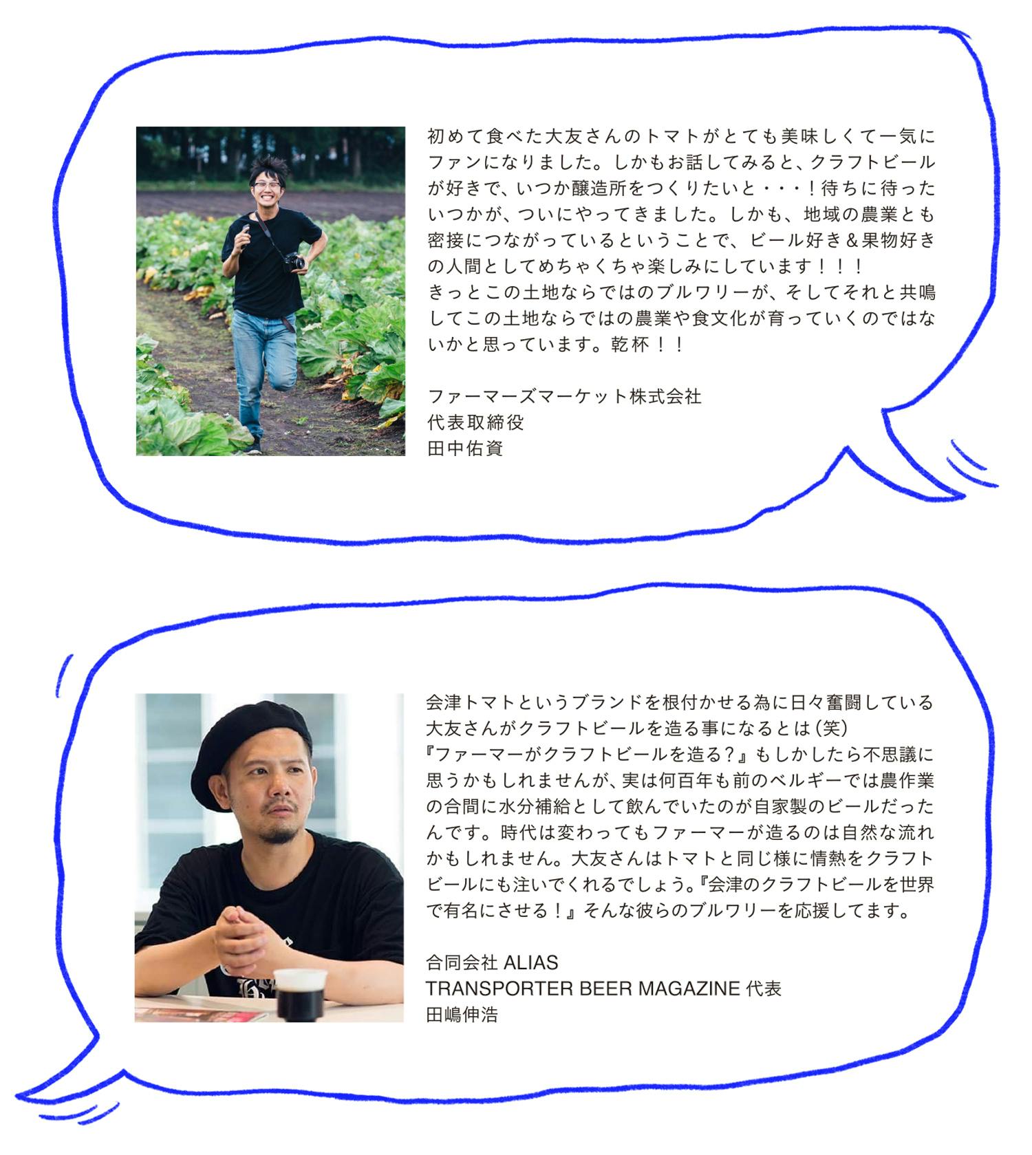 脱サラしてトマト農家に就農、独立してトマト農家を営む傍ら今度はビール造りを始めたい。何を言っているんだ、と笑われそうな人生ですが目の前にある自分の興味を追いかけ続け、出てきた課題の解決方法を探す、そんなことを繰り返して気がついたら会津にブリュワリーを作りたい!という強い想いを胸に動いていました。地元を出てたどり着いた会津という場所とこの場所の人々に惚れ込み、この場所でなら面白いことができる!やらなきゃもったいない!と心から思っています。自分以外の若い人にもここでの生活やこの場所の魅力を体験してもらい、色々な生き方があるということを見てもらえたらと思っています。また、会津に点在する魅力的なスポットがブリュワリーを通してコミュニティとして輪になって、多様な人が楽しめる、みんなに開かれた場所になればと願っています。