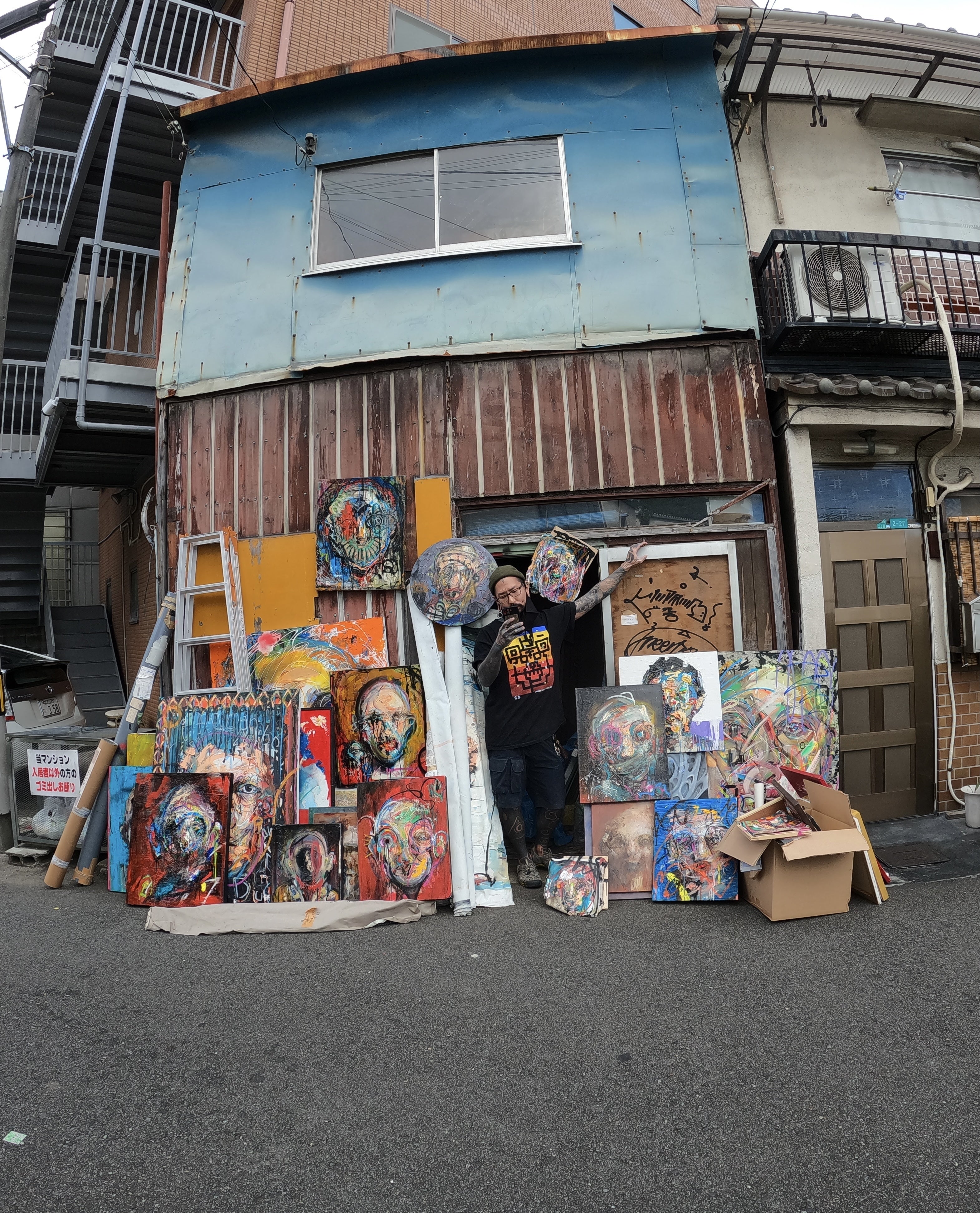 *背景の壁に直接、絵の具で描かれているのは第一弾アーティスト亜鶴氏のウォールペイントの作品です。