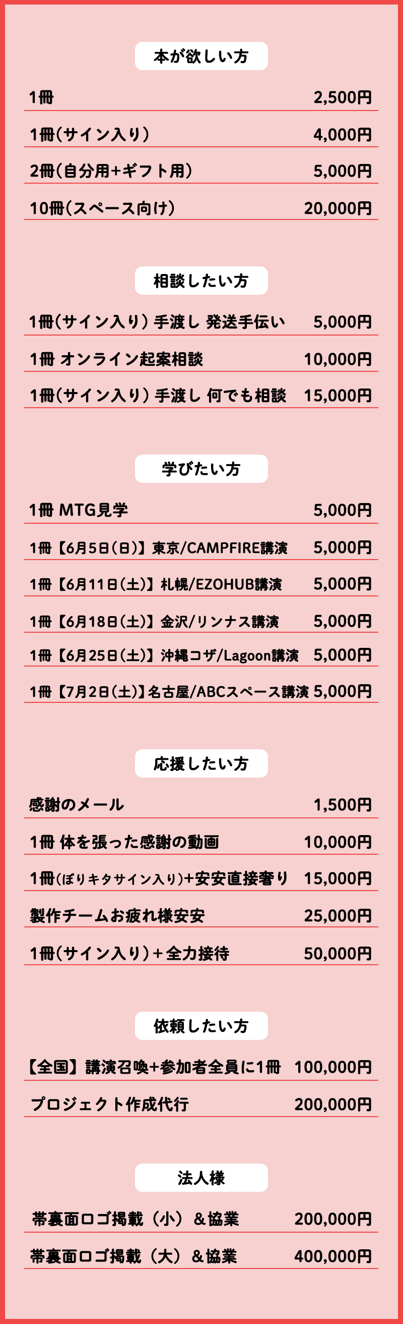 当プロジェクトのリターンと致しまして、完成した書籍をお届けする他、ぼく自身への個別相談、全国各地で開催するクラウドファンディングセミナーに参加できる権利をご用意させて頂きました。