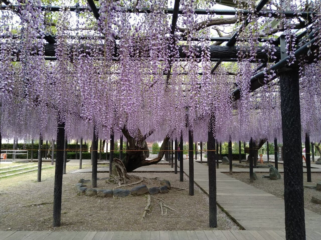 桜満開の京の都、ときの権力者平家一門の公達 平宗盛に寵愛されていた熊野(ゆや)は、母の危篤の知らせに何度も帰郷の許しを頼みますが、許されません。そればかりか花見の宴に供するようにと命じられます。桜のもとの宴席でも母を思う熊野。急に降り出した雨の中、舞い散る桜の花びらに今まさに命尽きようとしている老母への悲痛の想いを一首の歌に込めて詠みあげます。さすがの宗盛も心を打たれ、帰郷を許します。危篤の母を思う悲しみを内を秘めた熊野の舞が、美しく咲く桜の情景との対比で浮かび上がってきます。熊野の故郷である遠江国「池田宿」(とおとうみのくに「いけだのしゅく」)は現在の静岡県磐田市池田です。現在でも池田にある行興寺には熊野の墓があり、毎年5月ごろには長藤がみごとに花を咲かせています。