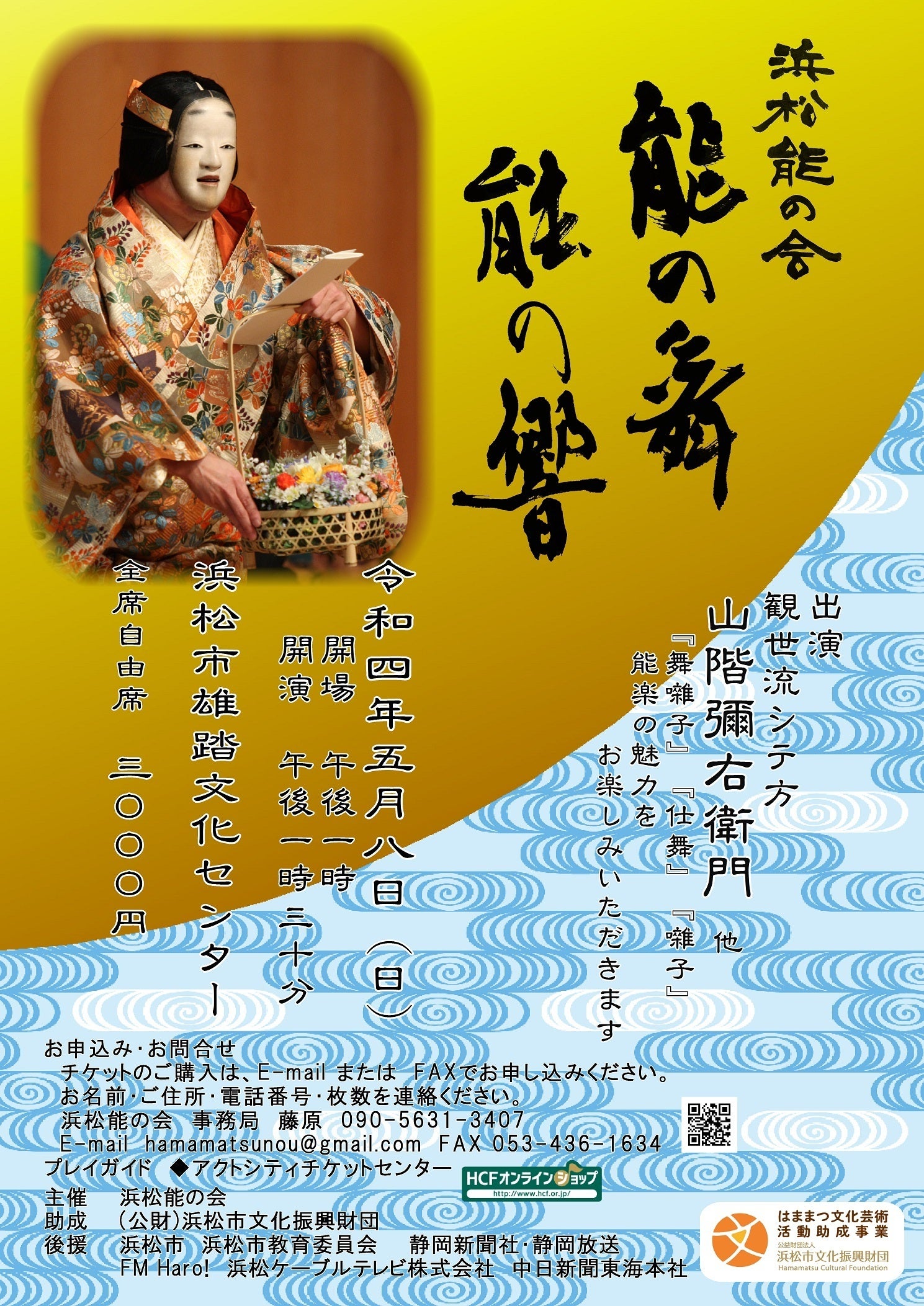 山階彌右衛門先生のもとで能楽の稽古をしている仲間で「浜松能の会」を立ち上げ、能楽を皆様の身近に体感していただき、本物の能楽師による「能」の素晴らしさをお届けしたい気持ちで活動をしています。以前 浜松城公園で開催されていた、観世宗家等による薪能のような本格的な能楽を企画する意気込みで取り組んでいます。