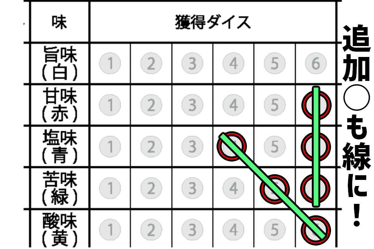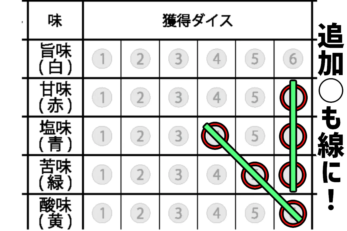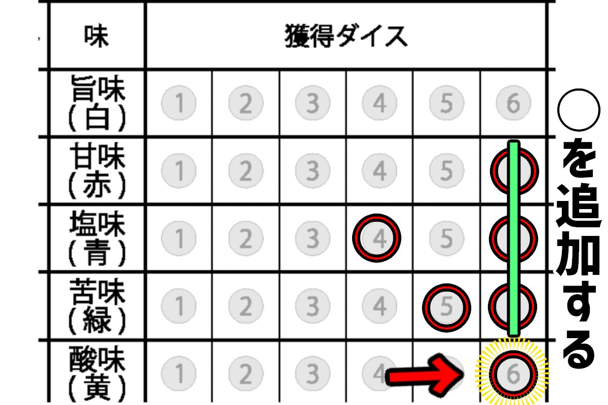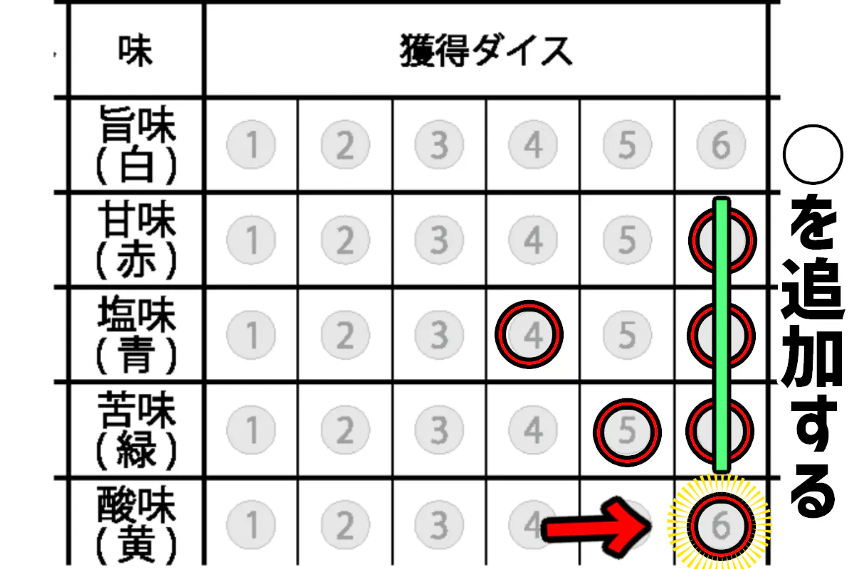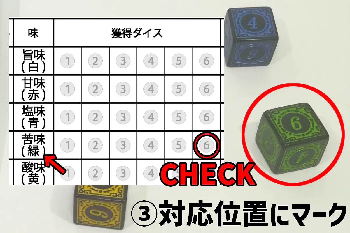 ③獲得したダイスに対応した位置にマークする