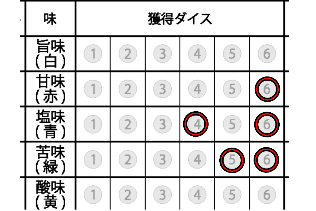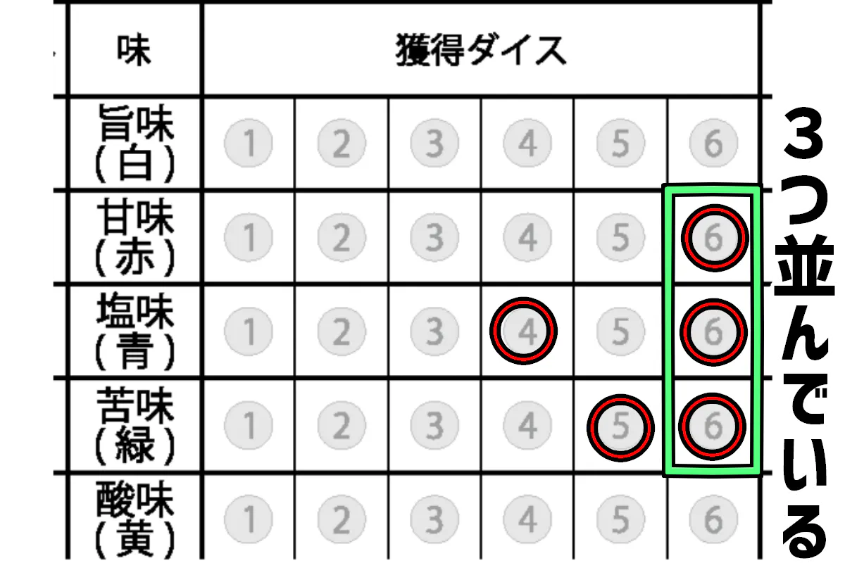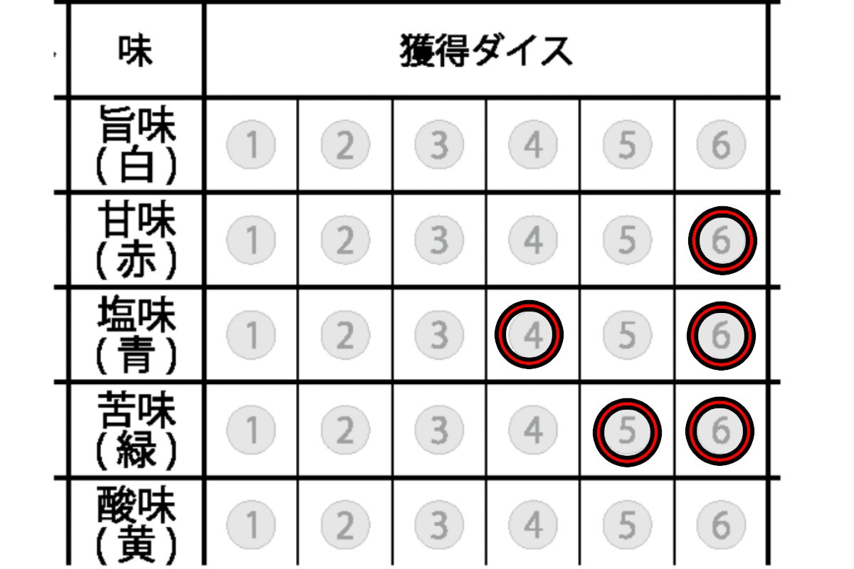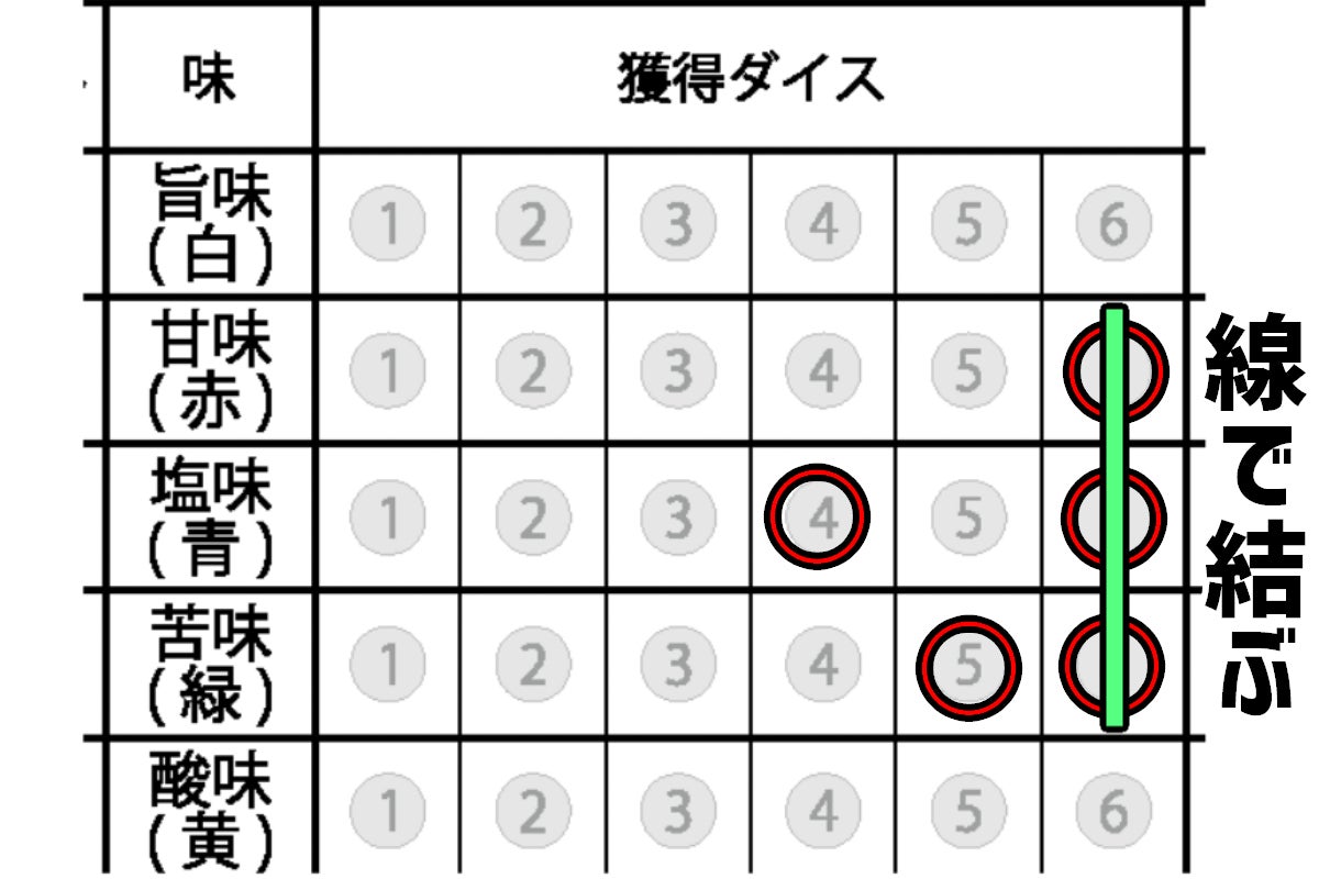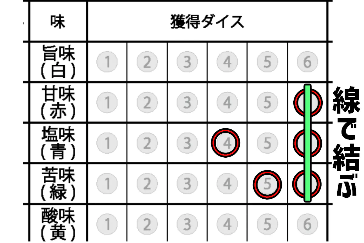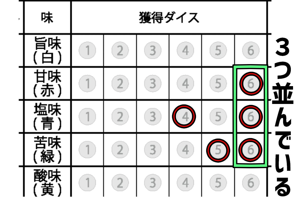 ③獲得したダイスに対応した位置にマークする