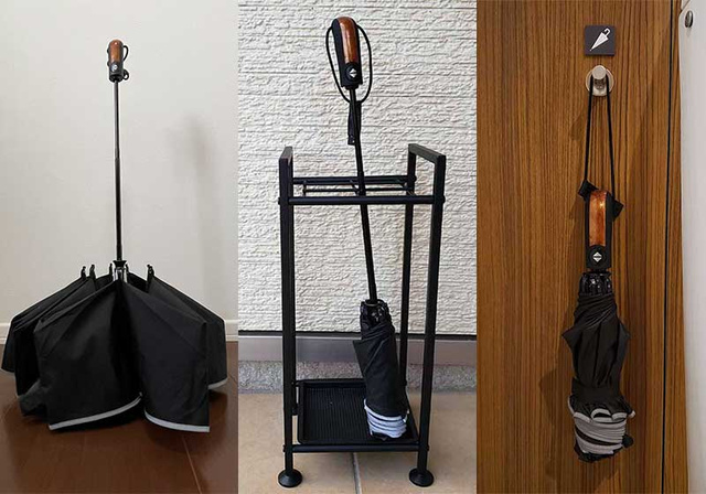 通常の傘は雨粒を振り落としてもどうしても傘に残ってしまい置くとまわりを濡らしてしまいます。