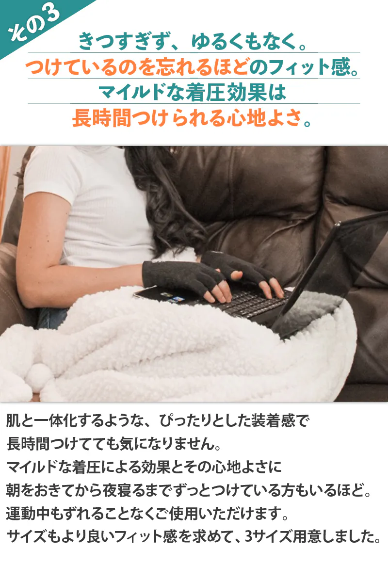 ※手を測ったサイズをもとに、3つのサイズのどれかをお選びください。手の測定値が閾値のちょうど中間付近であった場合、より着圧を求めるなら小さいサイズを、より快適さを求めるなら大きい方のサイズを選んでください。