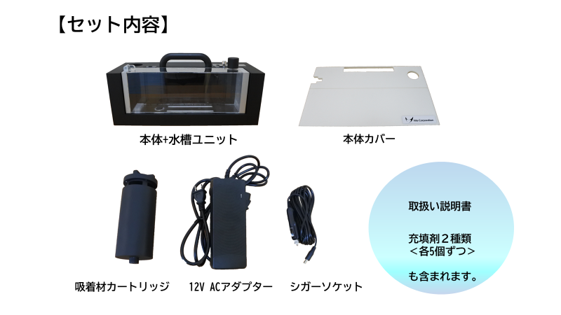本体+水槽ユニット、本体カバー、吸着材カートリッジ、12V ACアダプター、シガーソケット、取扱い説明書、充填剤2種(各5個入り)