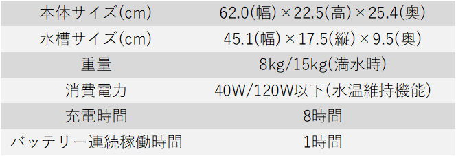 サイズ:62.0cm(幅)×22.5cm(高)×25.4cm(奥)、素材:ABS樹脂(本体)、ABS樹脂・アクリル樹脂(水槽ユニット)、ABS樹脂(吸着材カートリッジ)、軟質ウレタンフォーム(本体カバー)