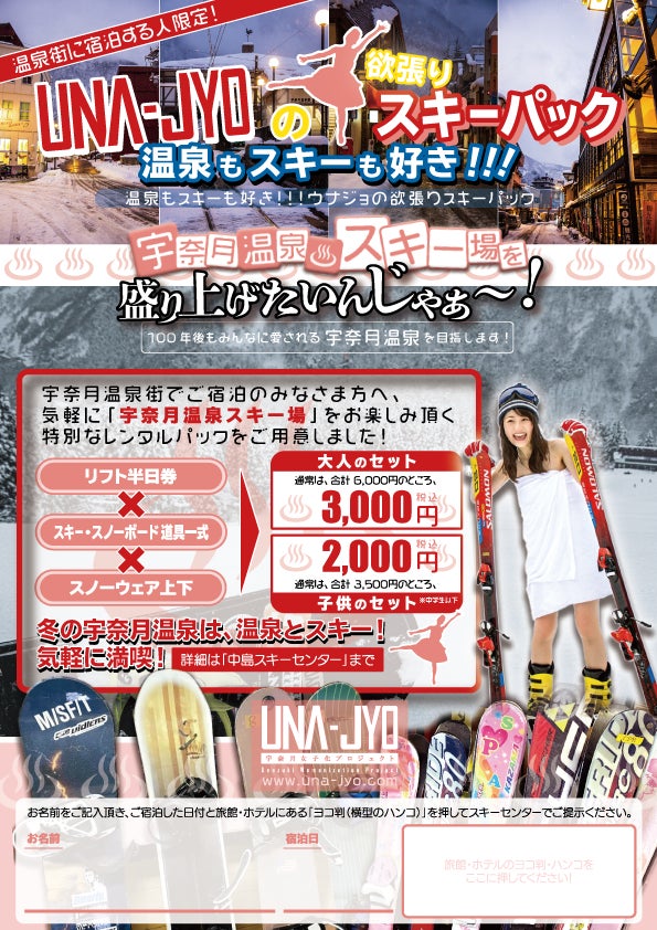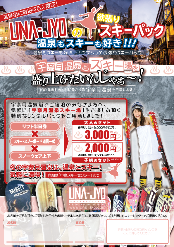 昨シーズンは、宇奈月温泉スキー場だけではなく、宇奈月温泉街ともコラボして、宿泊のみなさまへ気軽に宇奈月温泉スキー場を楽しんで頂く為に、オトクで特別なレンタルパックとして、「リフト半日券+スキー&スノーボード道具一式+スノーウェア上下」を中島スキーセンター様のご協力で格安にて提供し、冬の宇奈月温泉の楽しみ方を提案いたしました!