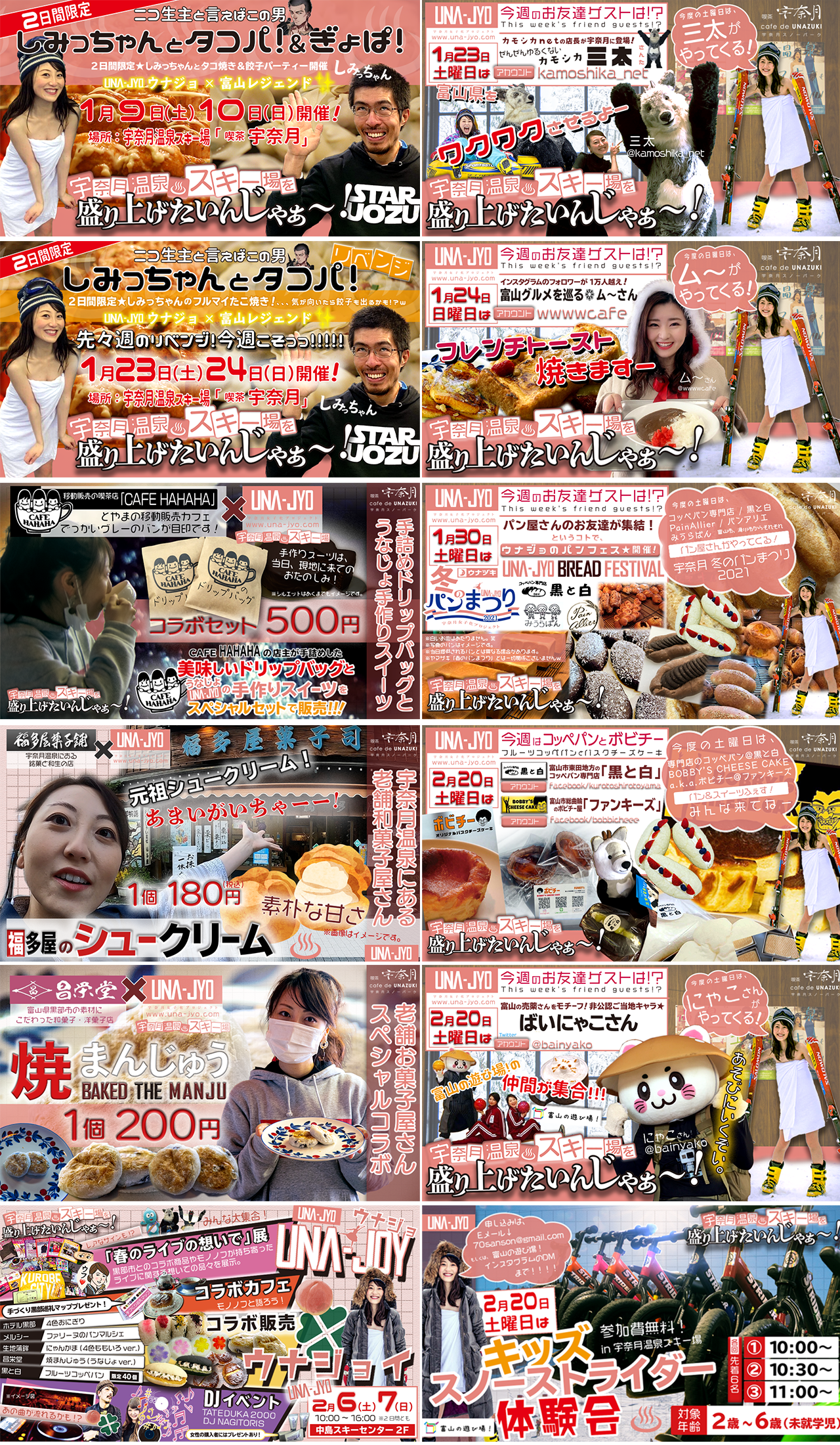 宇奈月女子化プロジェクトでは、昨シーズン、宇奈月温泉スキー場のCM動画を作り、また毎週、さまざまなイベントをスキーセンター内の喫茶「宇奈月」にて開催し、多くの人に宇奈月温泉スキー場へお越しいただきました。今シーズンは、さらにイベントを充実させ、もっともっと盛り上げたいと思って各種イベントを企画して準備しています!