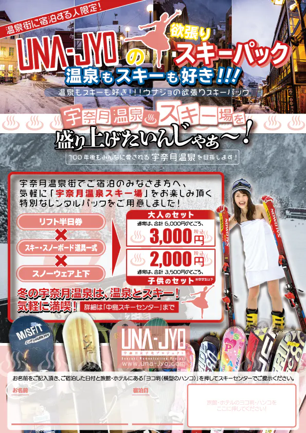 昨シーズンは、宇奈月温泉スキー場だけではなく、宇奈月温泉街ともコラボして、宿泊のみなさまへ気軽に宇奈月温泉スキー場を楽しんで頂く為に、オトクで特別なレンタルパックとして、「リフト半日券+スキー&スノーボード道具一式+スノーウェア上下」を中島スキーセンター様のご協力で格安にて提供し、冬の宇奈月温泉の楽しみ方を提案いたしました!