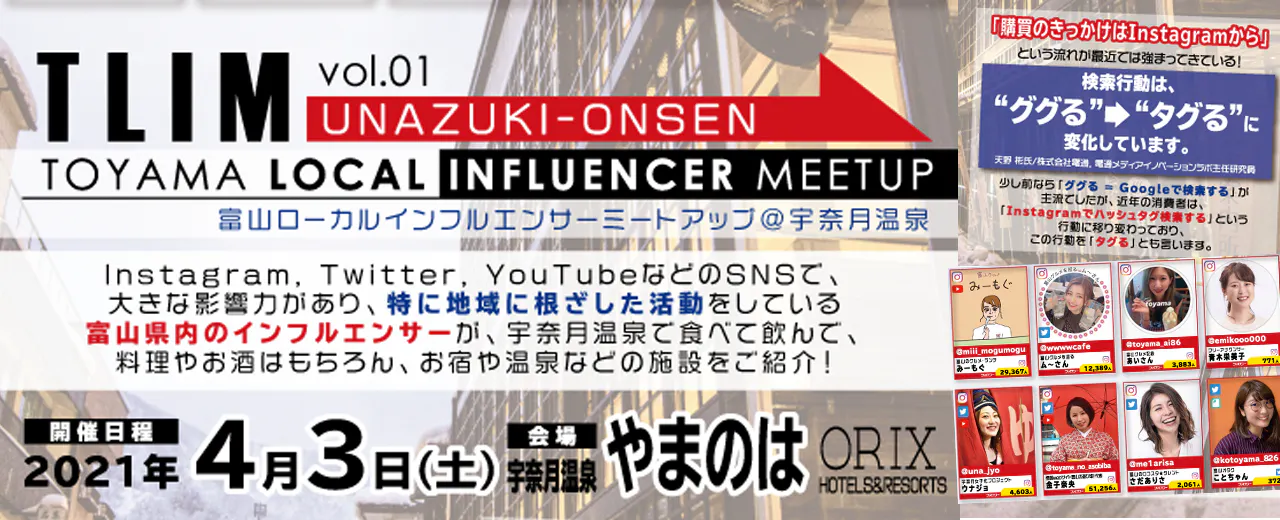 Instagram, Twitter, YouTubeなどのSNSで大きな影響力があり、特に地域に根ざした活動をしている富山県内のローカルインフルエンサーを宇奈月温泉「やまのは」さんにて、地元企業をつなぐイベントを開催いたしました。食べて飲んで料理やお酒はもちろん、お宿や温泉などの施設も後日、集まったインフルエンサーのみなさまに各ジャンルのSNSメディアで紹介していただきました!