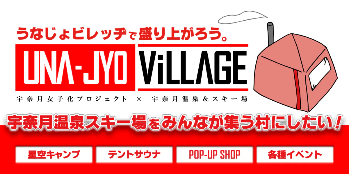 今シーズンは、さらに継続して安定したスキー場への来場者を増やすために、さまざまなイベントを実施したいと計画しています。今回立ち上げたこのプロジェクトでは、冒頭に申し上げました、今シーズンの宇奈月温泉スキー場を盛り上げるテーマである「冬キャンプ」に基づき、このスキー場を冬限定のキャンプ村「UNA-JYO ViLLAGE(うなじょビレッヂ)」で提供するサービスや各種イベント開催により、スキー場存続に課せられた、今シーズンの来場者数ノルマの達成を目指します!