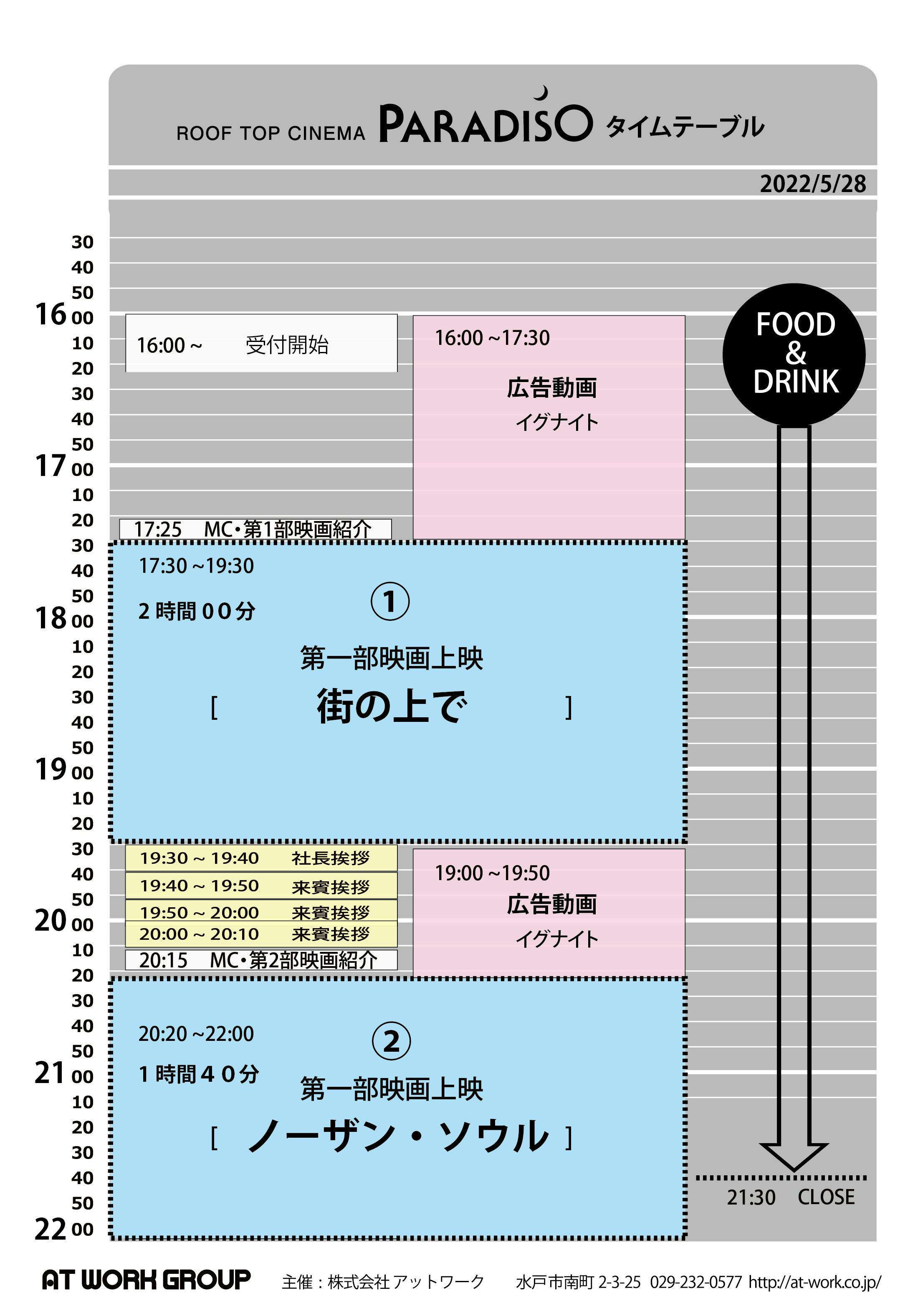 2022/05/28 11:00おはようございます◡̈⃝♬水戸市は気持ち良い朝を迎えました。いよいよ“roof top cinema PARADISO“開館です。タイムテーブルの確認お願いします。支援者さまは”CAMPFIRE”でのご自分の支援した記録のページのスクショを保存していらっしゃると受付が早く済ませられますのでご協力お願いします。受付場所はエレベーターで直接6階まで上がってください。入場ブレスレットを付けさせていただければ出入りは自由になりますので弊社のSHOPでもウインドウショッピング頂けたら幸いです。上映2本と長丁場のイベントなのでお腹の具合も気になると思いますのでfood &drink のご紹介しておきます。 フードトラックでお馴染みの"togo togo"さんは敷地内の駐車場で営業して頂けますしテーブルなども用意してありますのでそこでも召し上がれます。お支払いは全てキャッシュオンになりますので細かいお金の用意がありがたいです。お酒のアテからメインのごはんまで揃えましたので今夜はすっかりシネマ三昧で楽しみましょう。C'mon Join Us <3※マスク着用、検温、アルコール消毒のご協力お願いします。 もっと見る