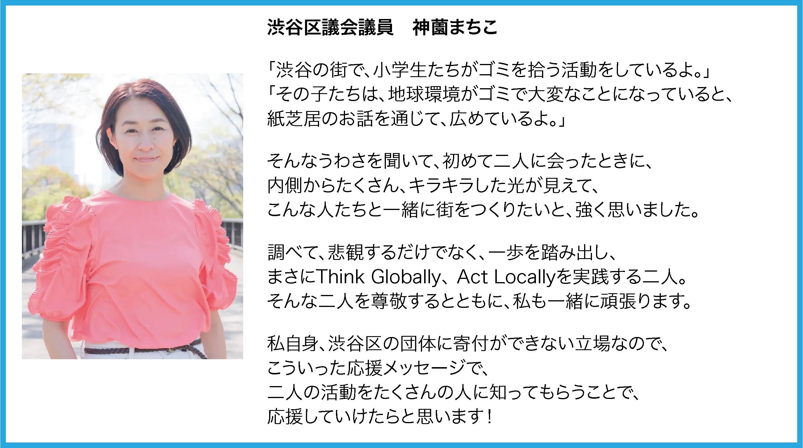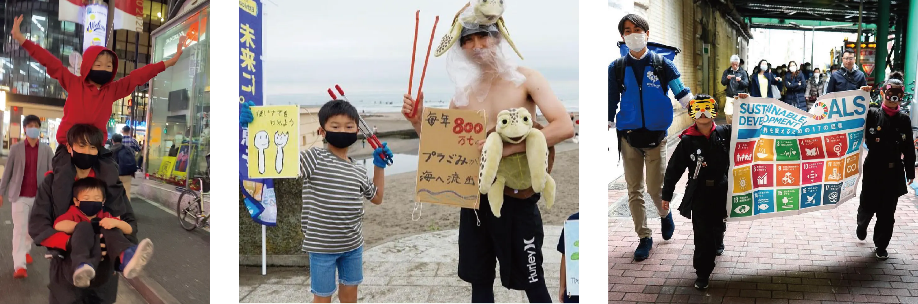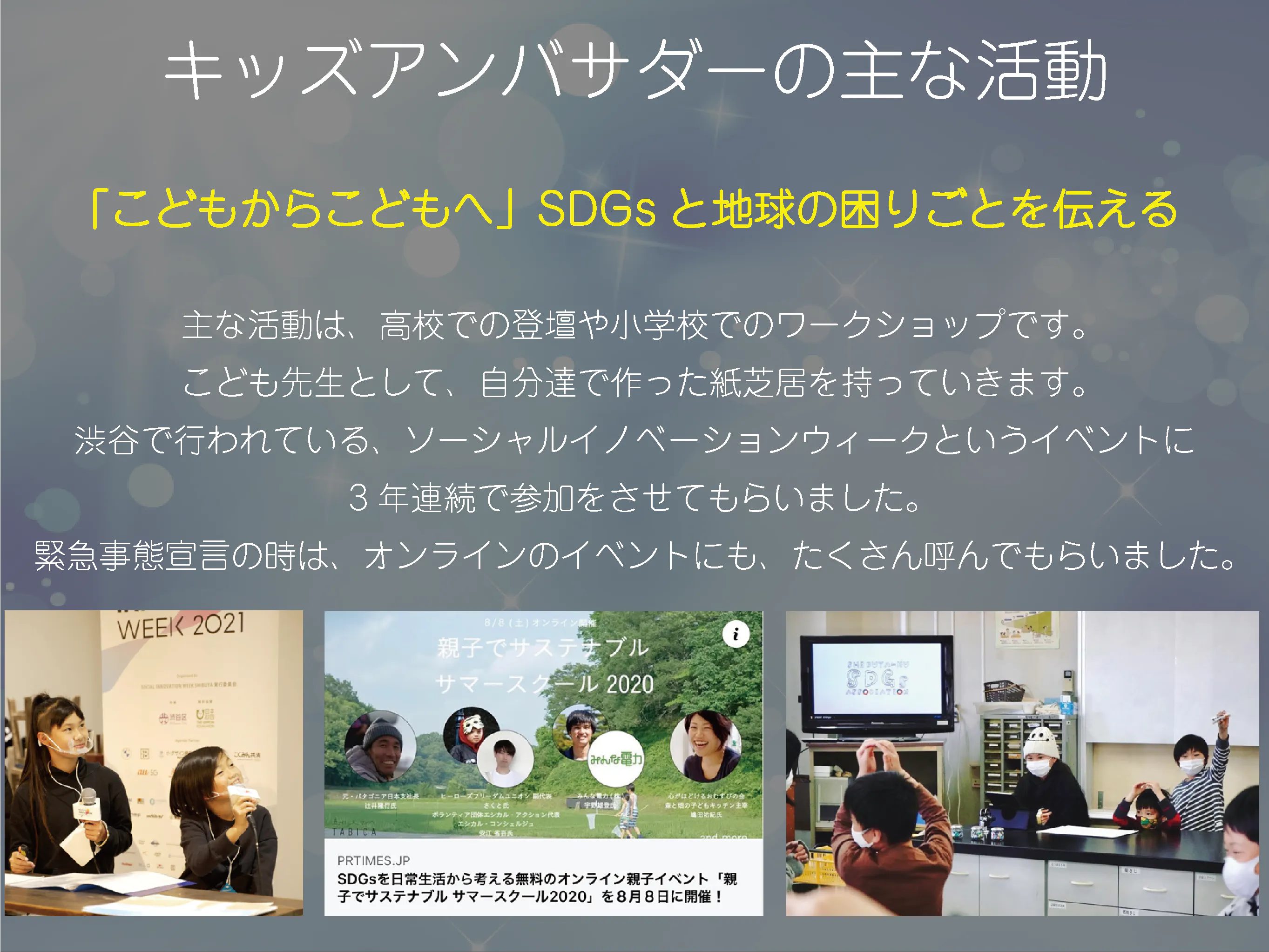 僕たちは、3年前に参加した「海の自由研究フェス」というイベントで、海洋ごみの約8割が街から来ている事を知って、SDGsと出会い、地球の現状や海の困りごとを知り、その事をたくさんの人に伝えたくて、渋谷区SDGs協会のキッズアンバサダーになりました。