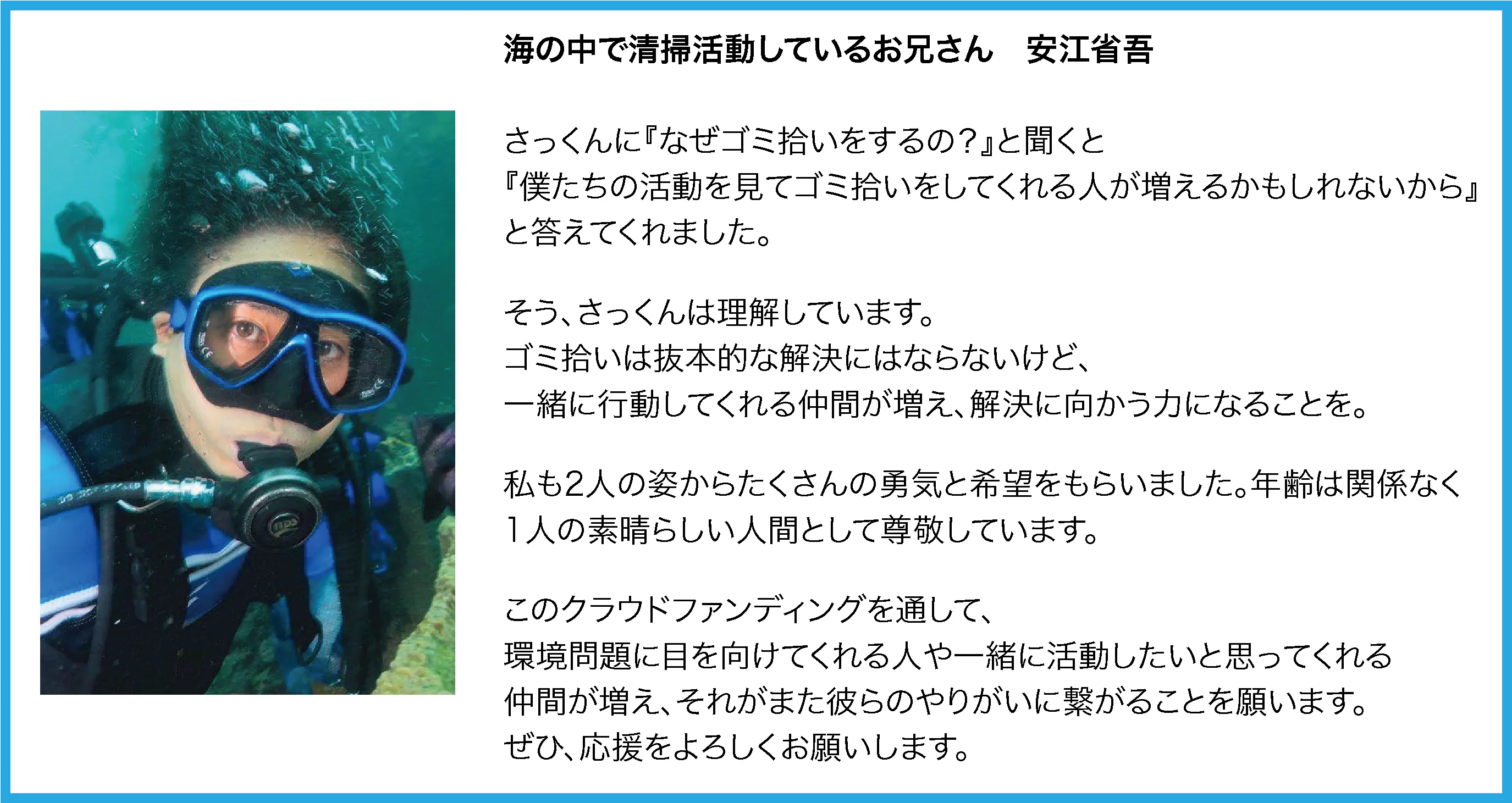 そのお兄さんは、僕にたくさんの事を教えてくれて、実際の海の中の清掃活動の時の動画を見せてくれたりしました。