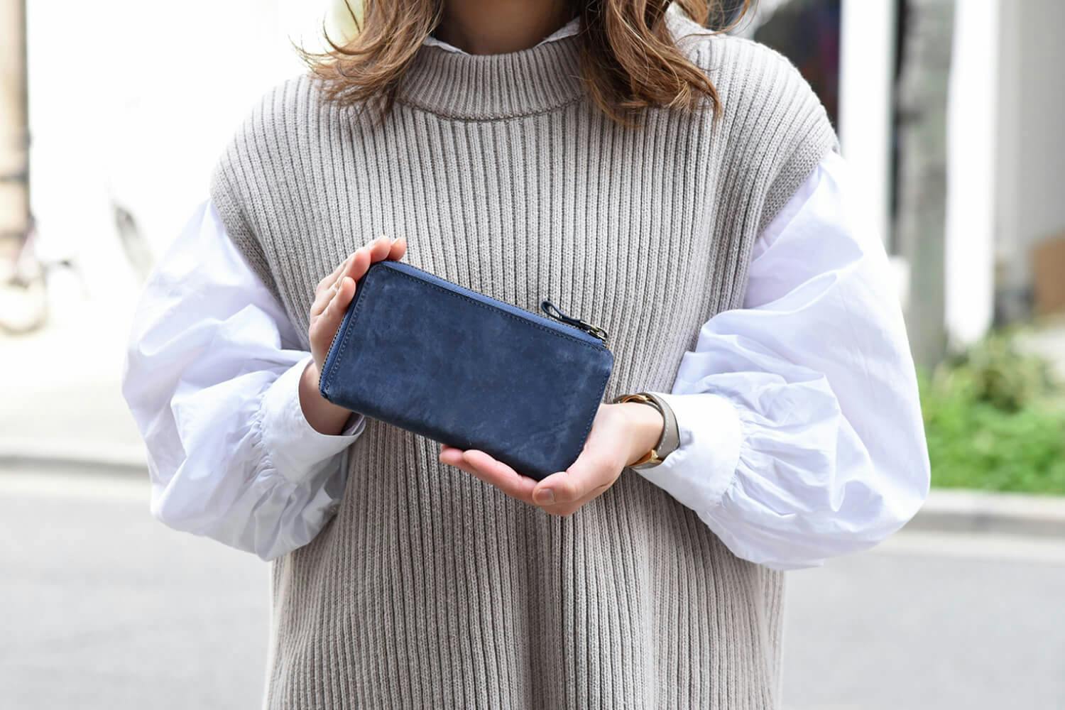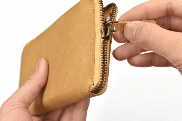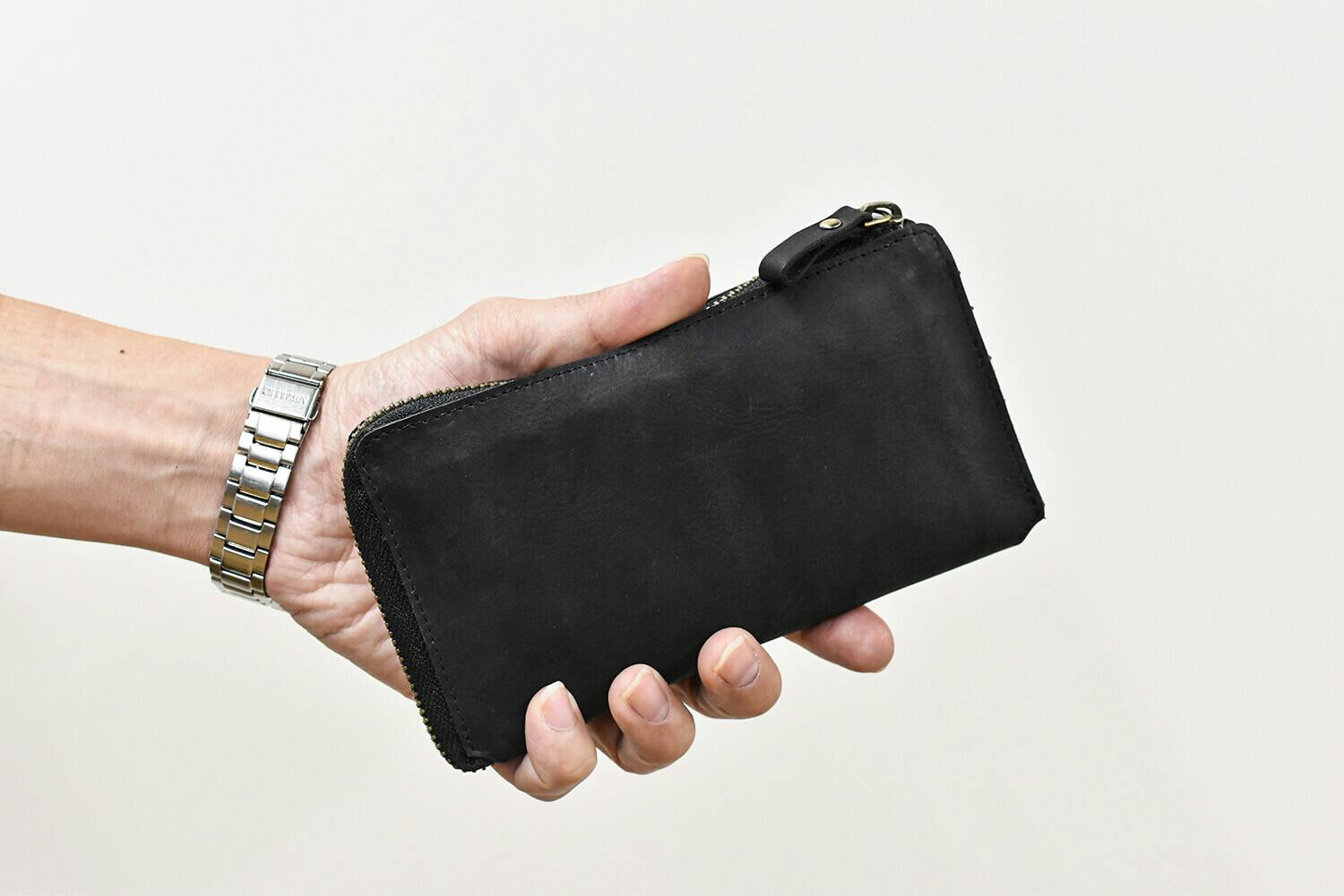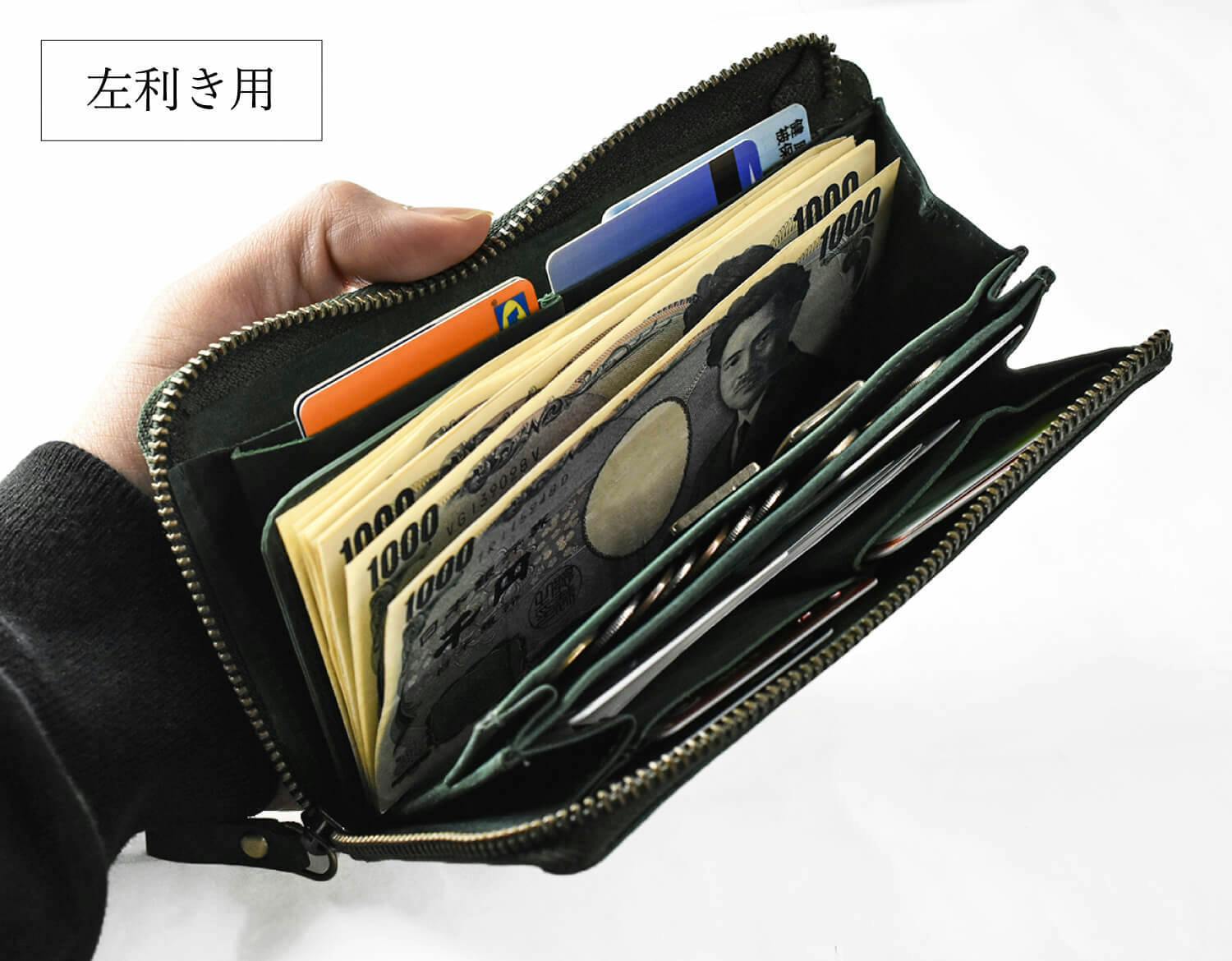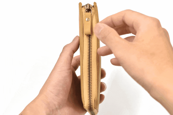 一万円札が折らずにちょうど収まる、ファスナータイプの長財布では紙幣と干渉しないほぼ最小サイズに仕上げています。