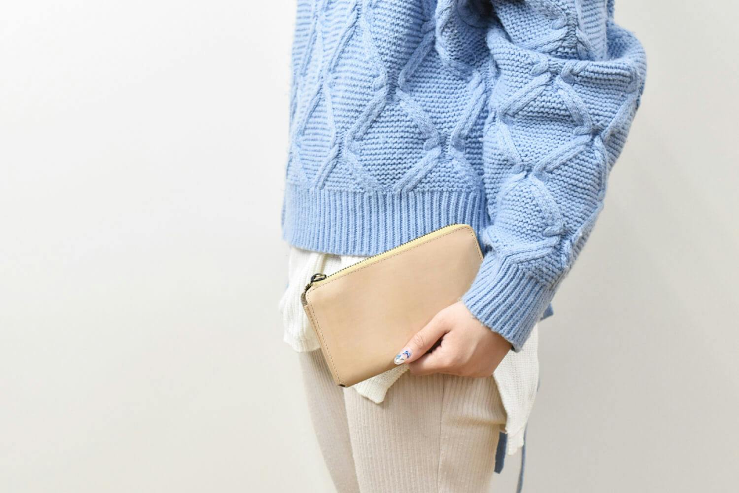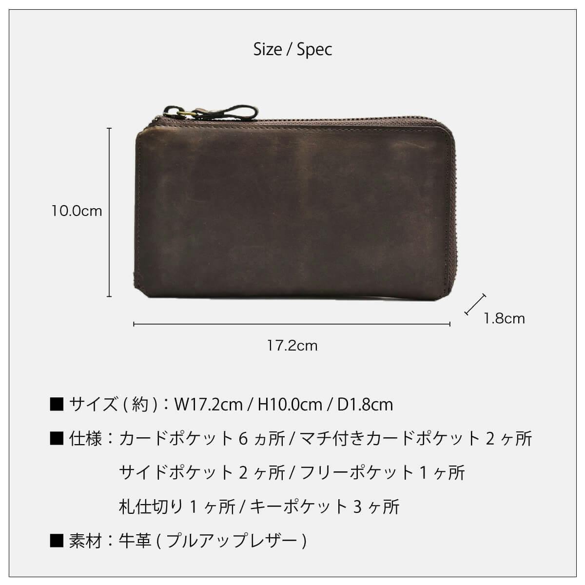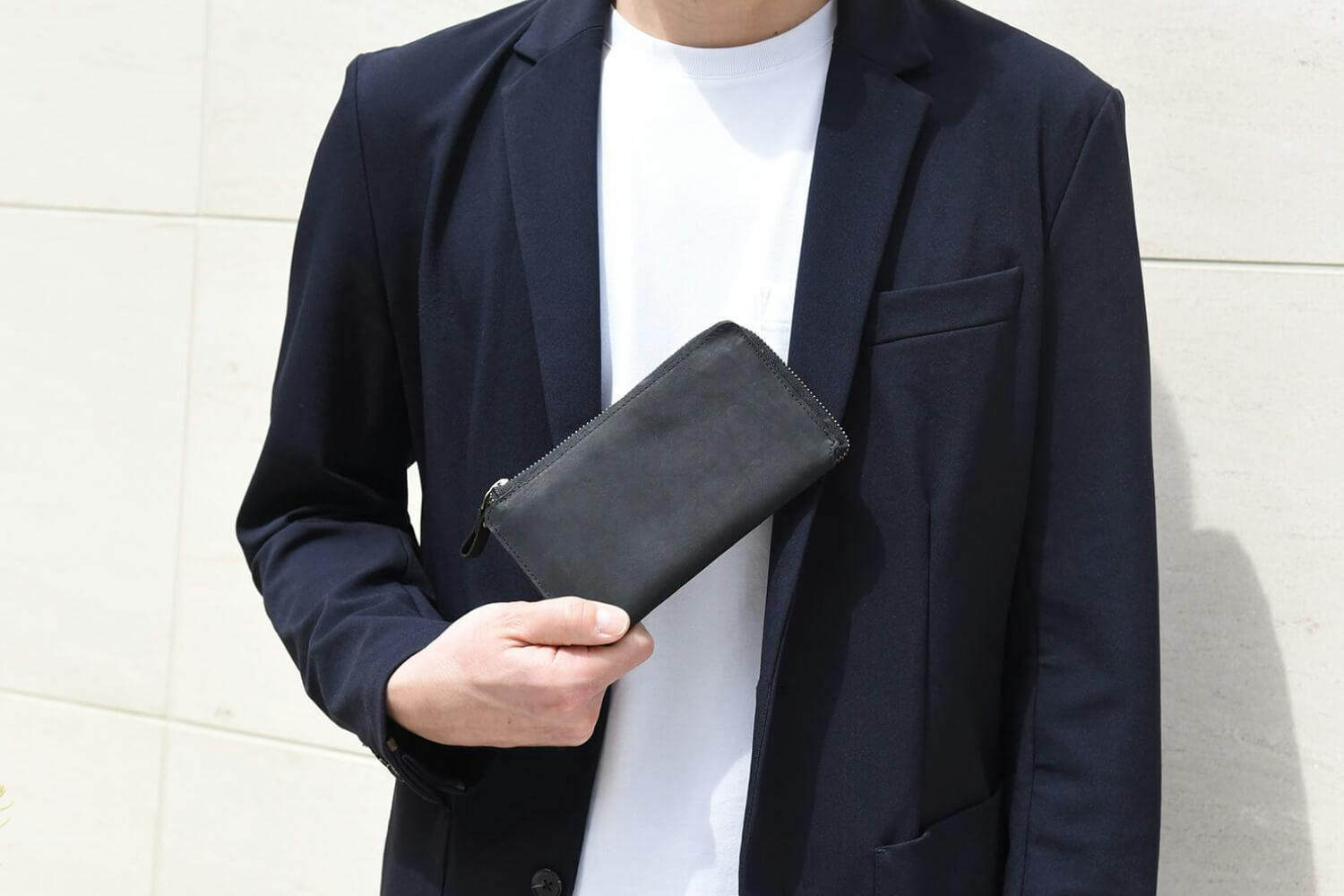 一万円札が折らずにちょうど収まる、ファスナータイプの長財布では紙幣と干渉しないほぼ最小サイズに仕上げています。
