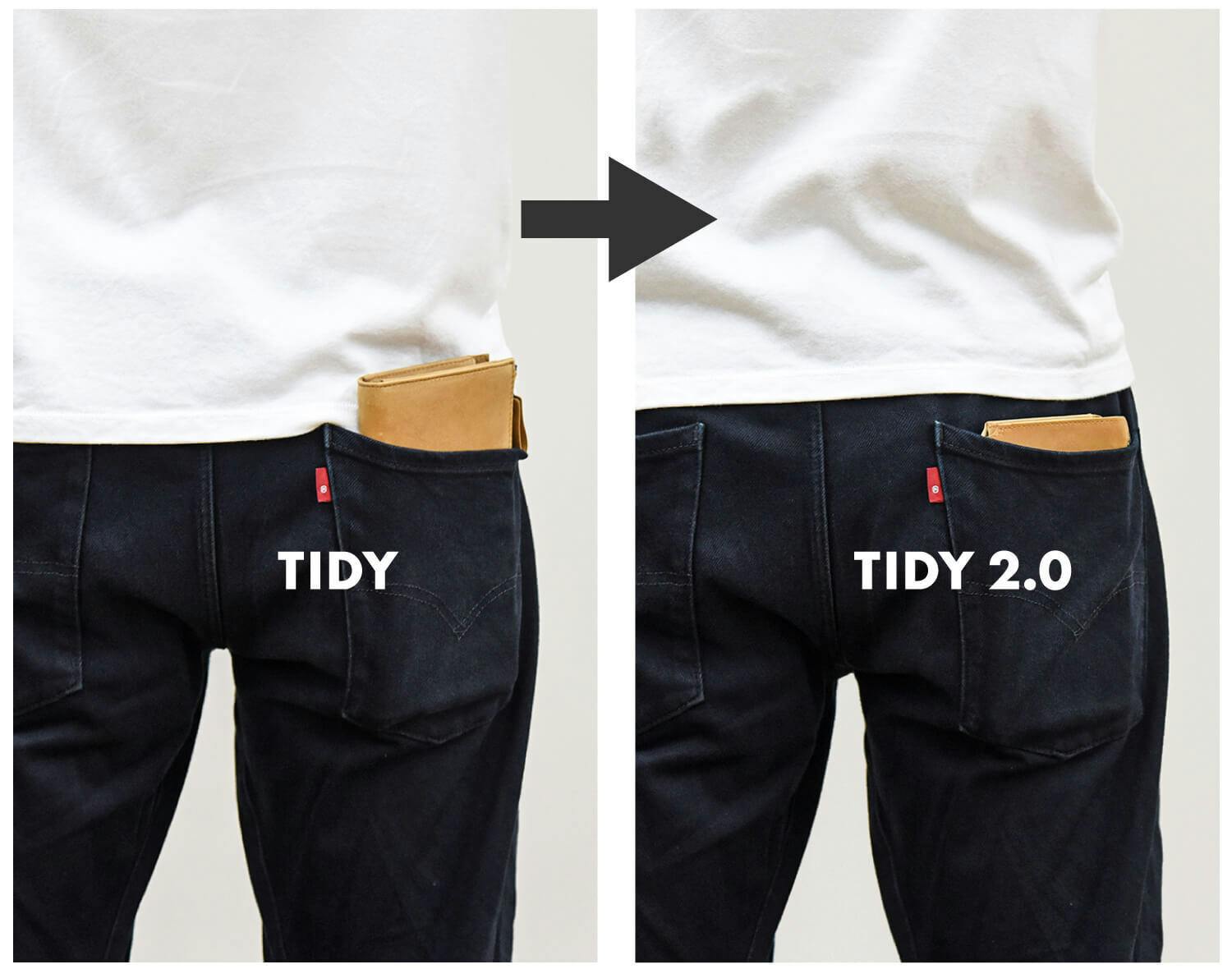 TIDY 2.0なら短く、薄いのでポケットに入れてもかさばりにくくスマートなまま。バッグが無い時でも持ちやすいので、今までよりも気軽に長財布を楽しんでいただけます。