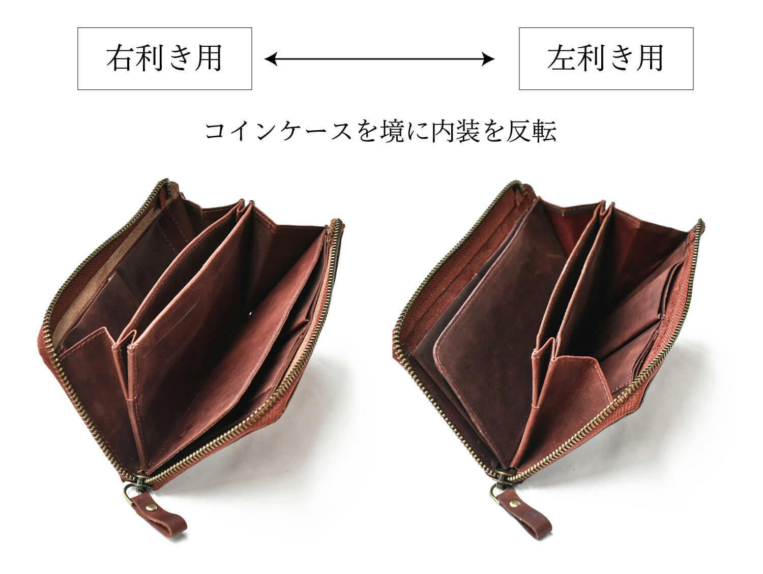 一般的に財布は「右利き用」に作られることがほとんどです。しかし私たちは、出来るだけ多くの方にとって使いやすいデザインを目指すべく、「左利き用」も製作しました。