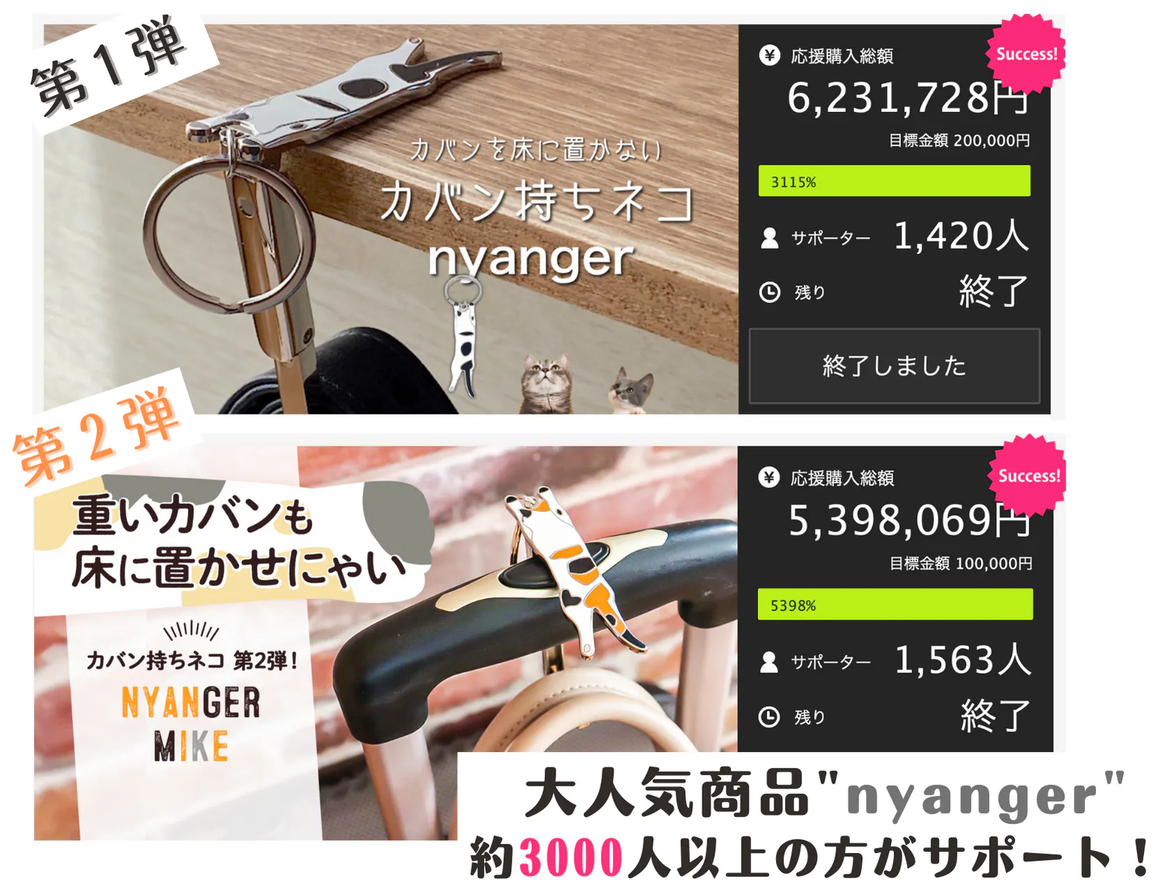 2024/09/21 21:22nyangerシリーズ21,798,453円達成し、累計1万人以上にご支援頂いた人気プロジェクト!「荷物を床に置かないカバン持ちネコ」多数のご要望を頂きプロジェクト再掲載!★プロジェクト開始です★https://camp-fire.jp/projects/792038/view 荷物を床に置かないカバン持ちネコ「nyanger KURO」①寝そべる姿でネコがバッグを持ち!②使用しない時はバッグにぶら下がります!③軽量なのに7㎏を楽々持ち上げ力持ち! ④キーホルダー型で持ち運びも楽々!☆☆☆☆☆☆☆☆プロジェクトページを☆☆☆☆☆☆☆☆是非、一度ご覧ください。 荷物を床に置かないカバン持ちネコ「nyanger KURO」↓プロジェクトページはこちら↓ もっと見る