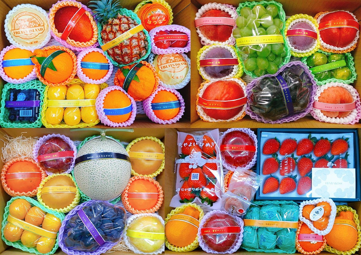 12月:プレミアムいちご、ルレクチエ、紅まどんな、太天柿、香緑(キウイ)、蜜入りりんご、プレミアムみかん、王林、など