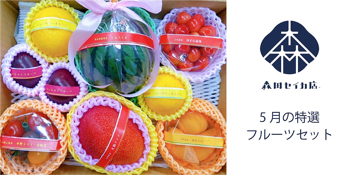 5月:藪塚産小玉スイカ、宮崎県産完熟マンゴー、パッションフルーツ、温室びわ、温室佐藤錦、ニューサマーオレンジ、など
