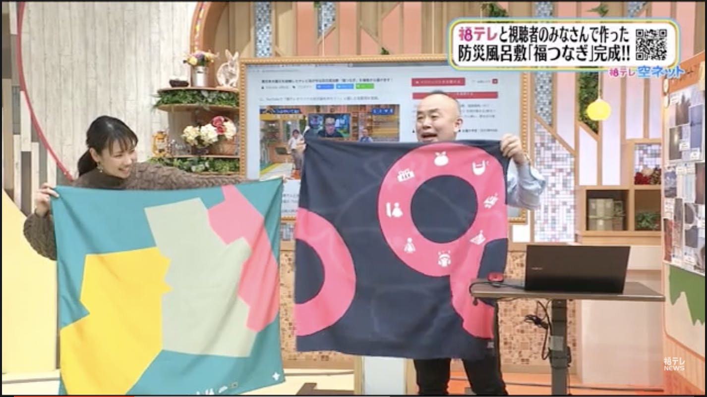 今回、自社初のクラウドファンディングチャレンジとして、災害時に使用できる防災風呂敷を開発しました。私たち放送局が、皆さん一人一人とつながるツールの1つとして、そして「福」がつながってほしいという想いを込め『福つなぎ』と名付けました。一人でも多くの方にご利用いただけたらと考えています。
