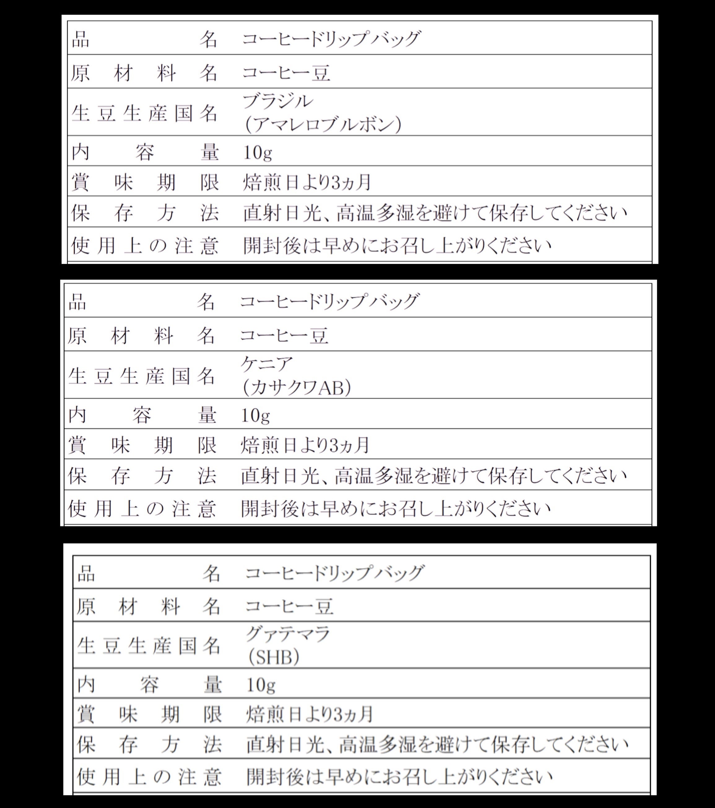 ※ドリップバッグの食品表示ラベル