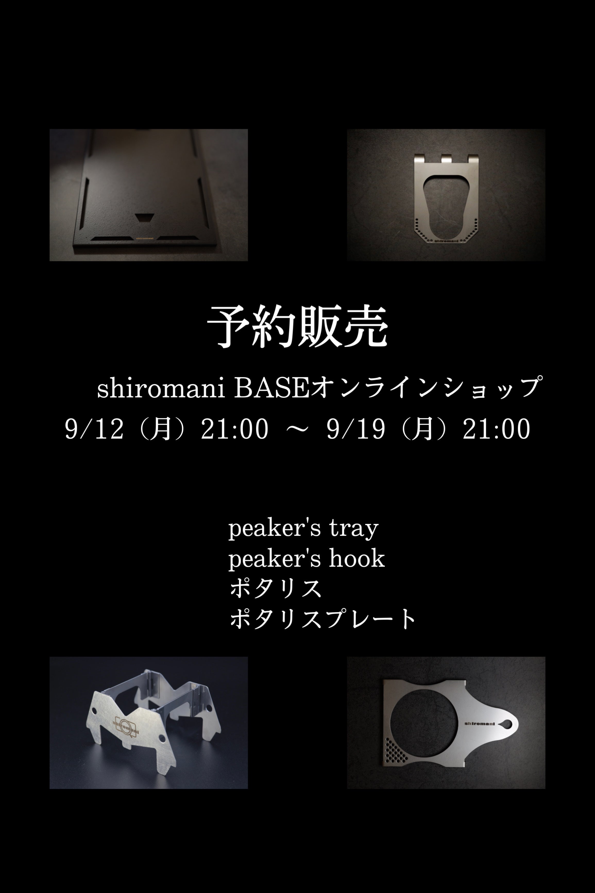 2022/09/01 17:25皆さんこんにちは!ポタリスのプロジェクト完了から約半年が経ちました。その後、多くの方にポタリスを使って頂き、またSNSでは素敵な投稿も!本当に感謝しています。新製品も好評で皆様から沢山のお問合せを頂いております。つきましては、ポタリスをはじめshiromaniオリジナルの4商品の予約販売を実施致します。shiromani BASEショップhttps://shiromani.thebase.in/予約開始 9/12(月) 21:00予約終了 9/19(祝・月)21:00販売商品・ポタリス・ポタリスプレート・peaker's tray・peaker's hookご興味ある方は是非、shiromaniのBASEショップをチェックしてみて下さい。よろしくお願いします。shiromani もっと見る