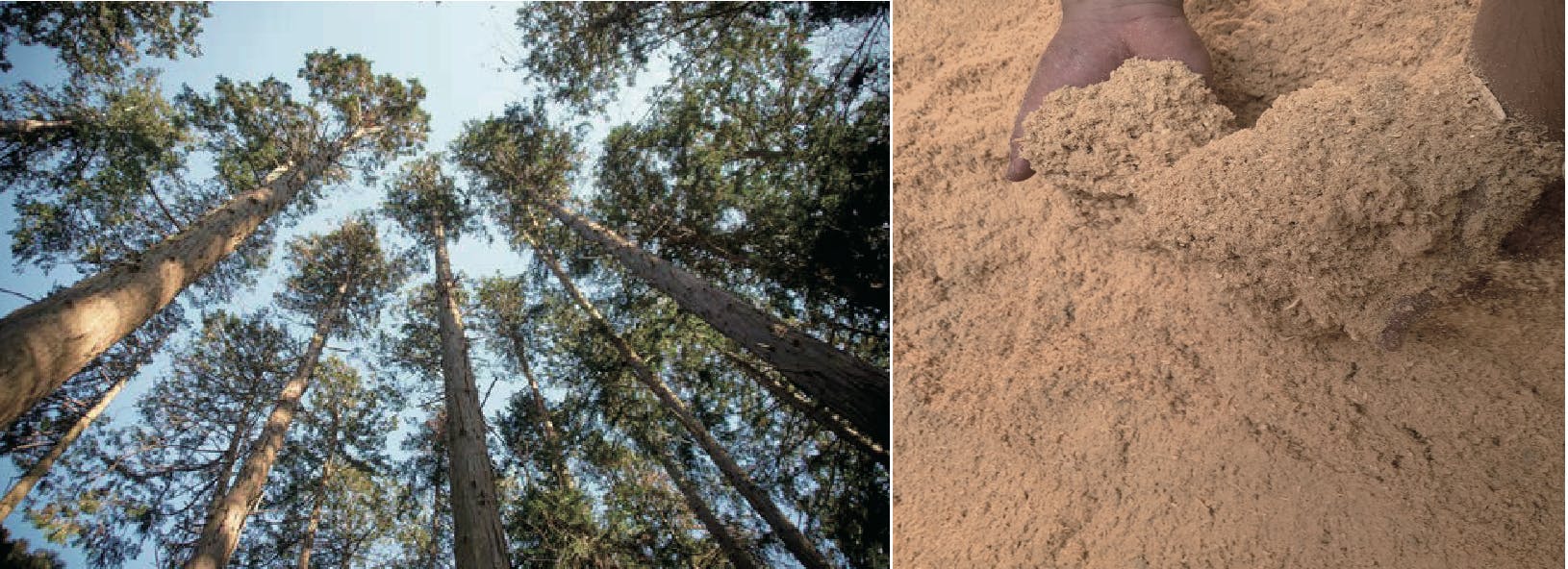 樹齢50 年を超え10m 以上の高さまで育ち伐採期をむかえたヒノキ。オイルは、実はこの大きな成木1本からわずかにグラス一杯程度の量しか採取できない、非常に貴重なものです。
