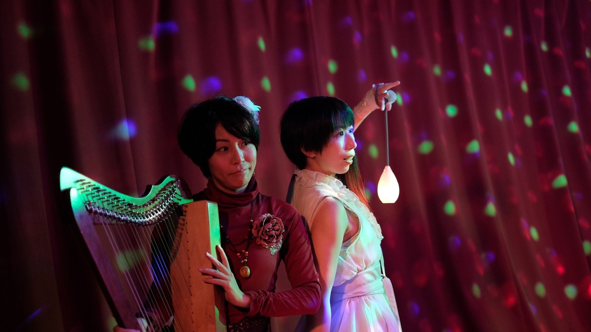 ハープ弾き語りのAGATAと、ポイスピナー森屋純(ジャグリング・ユニット・フラトレス)の、詩人と道化のユニット。