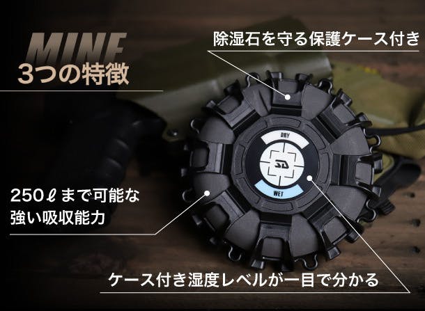現在はゲームの装備品にだけでなく、アウトドア用品、カメラ、楽器などの様々なシーンに使用できる商品の開発によって、幅広いお客様に愛用されています。 DRYTECHの技術によって、MINEは使い捨てされる従来の乾燥剤の代わりとなりました。 我々のモットーは、自社の製品で地球への負担を減らし、次の世代により良い環境を提供することです。