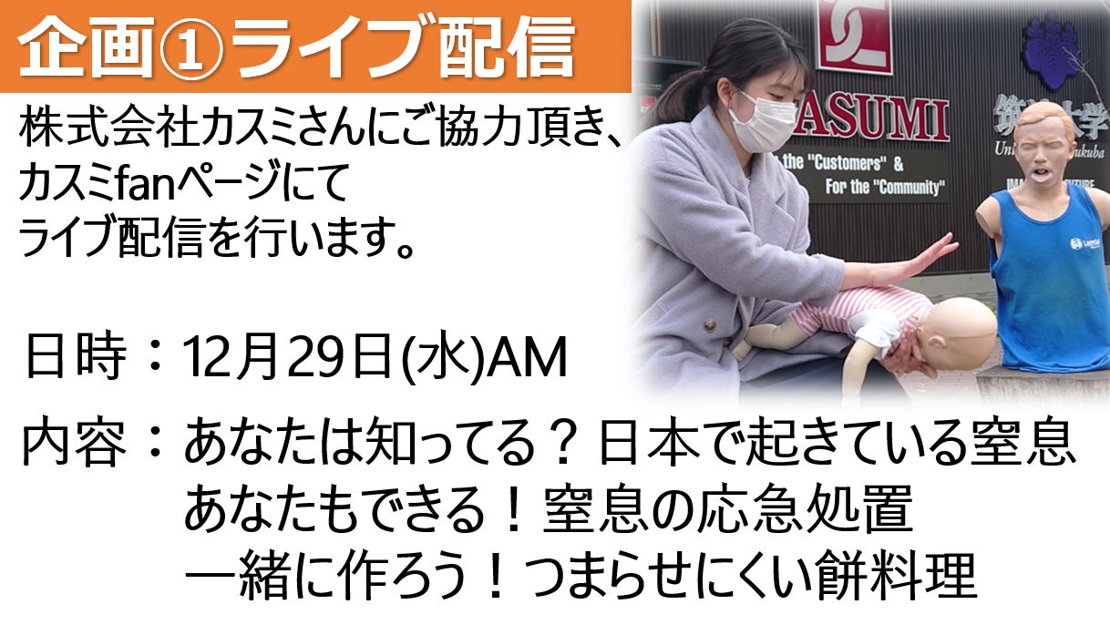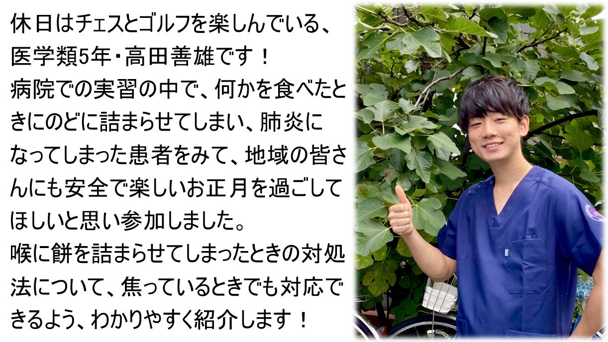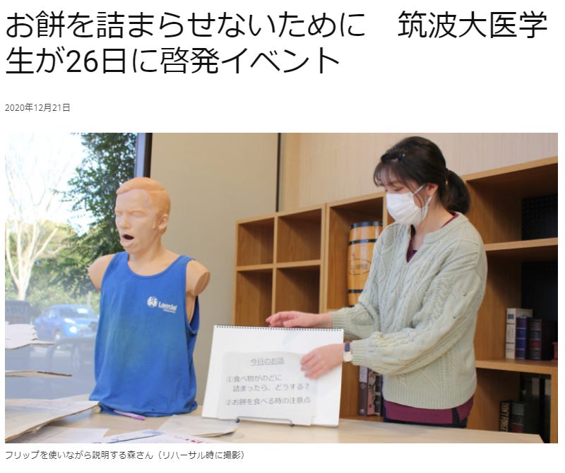 本プロジェクトでは、もちでの窒息を中心に、食べ物による窒息を予防するために筑波大学の医学生有志10名が 医師・企業・研究者・行政の協力を得て、様々な企画を展開します!!